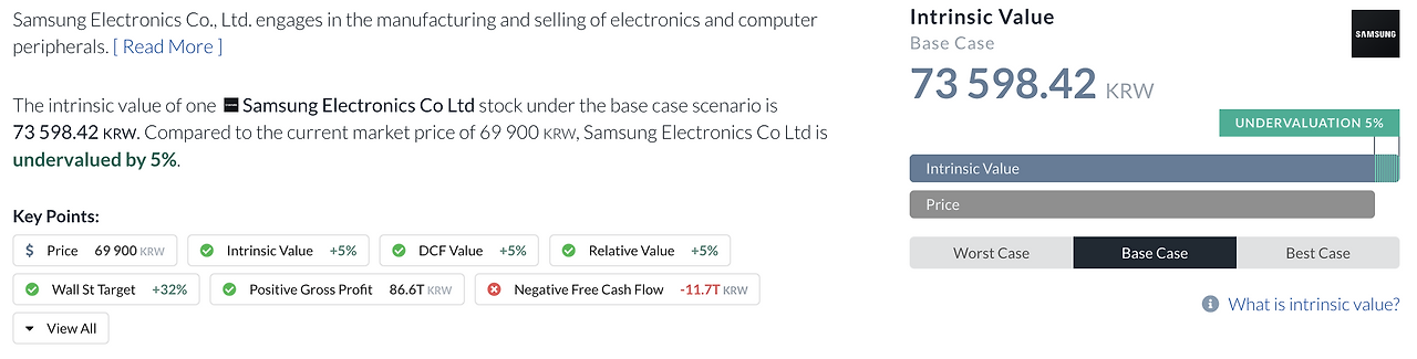 11월 9일 삼성전자 주가는 69,900원이다. 주가는 내재 가치보다 5% 저평가되어 있고, 안전마진은 3,698원 (3,698=73,598-69,900)이다.