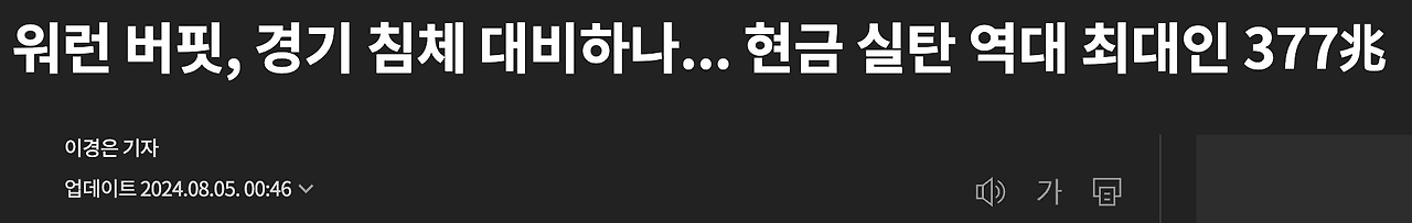 워런 버핏이 2023년 5월에 현금을 171조 원 보유하고 있었는데, 2024년 8월에는 377조 원까지 늘렸습니다.