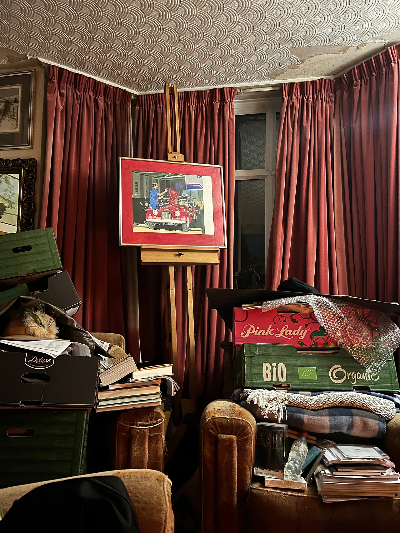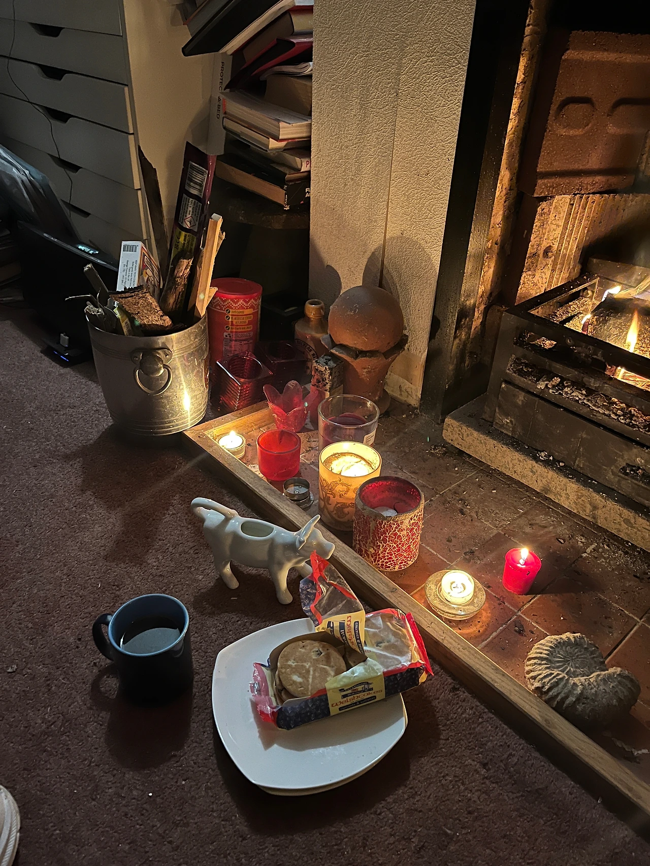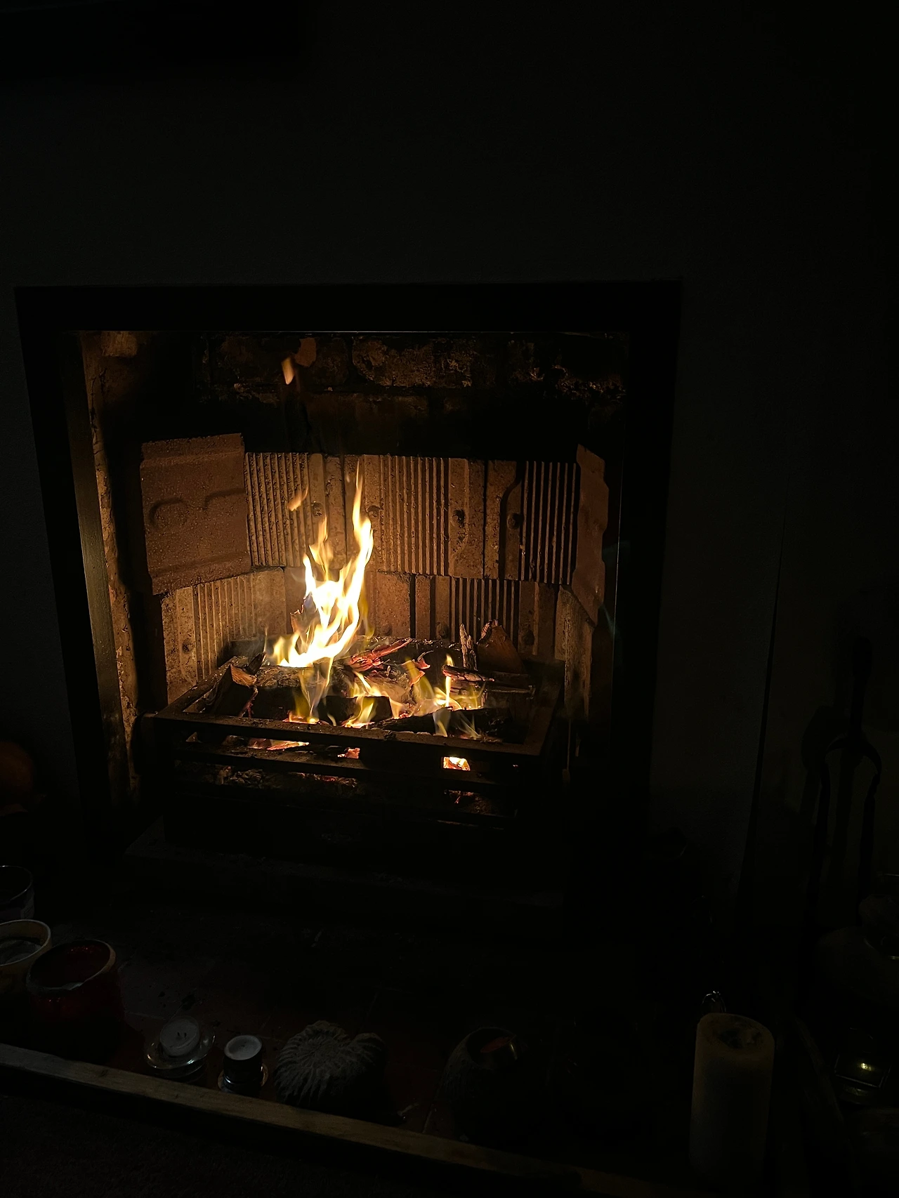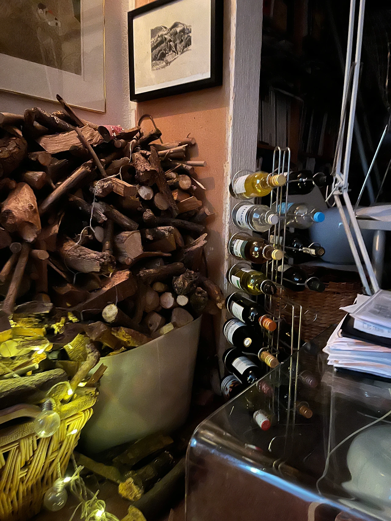 1층은 작업실에 가까웠다. 지저분하고 먼지가 많다며 양해를 구하셨지만, 그런 건 우리에게 전혀 중요하지 않았다. 한국보다 훨씬 추웠던 영국 길바닥에서 시간을 보내는 것보다야 뭐든 나으니까. 들어가자마자 벽난로가 우릴 반겨주었고, 벽난로 앞에는 소파가 그 옆엔 작장나무와 와인, 겹겹이 쌓인 책들과 인테리어 소품 및 액자들. 얼핏 보면 지저분해 보일 수 있지만 나에겐 모두 인테리어로 보였다.
