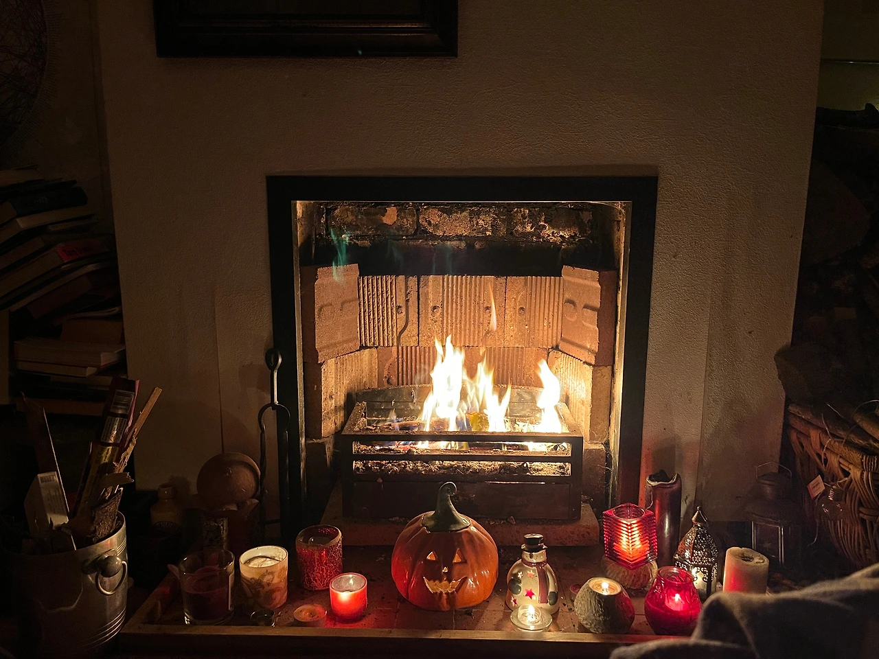 소파에 자리 잡자 춥진 않냐, 몸은 괜찮냐 묻자, 예뻐서 사진도 찍었다고 말하니 벽난로 앞을 더 예쁘게 꾸며주신다. 곧 핼러윈이었어서 귀여운 호박 캔들워머로.