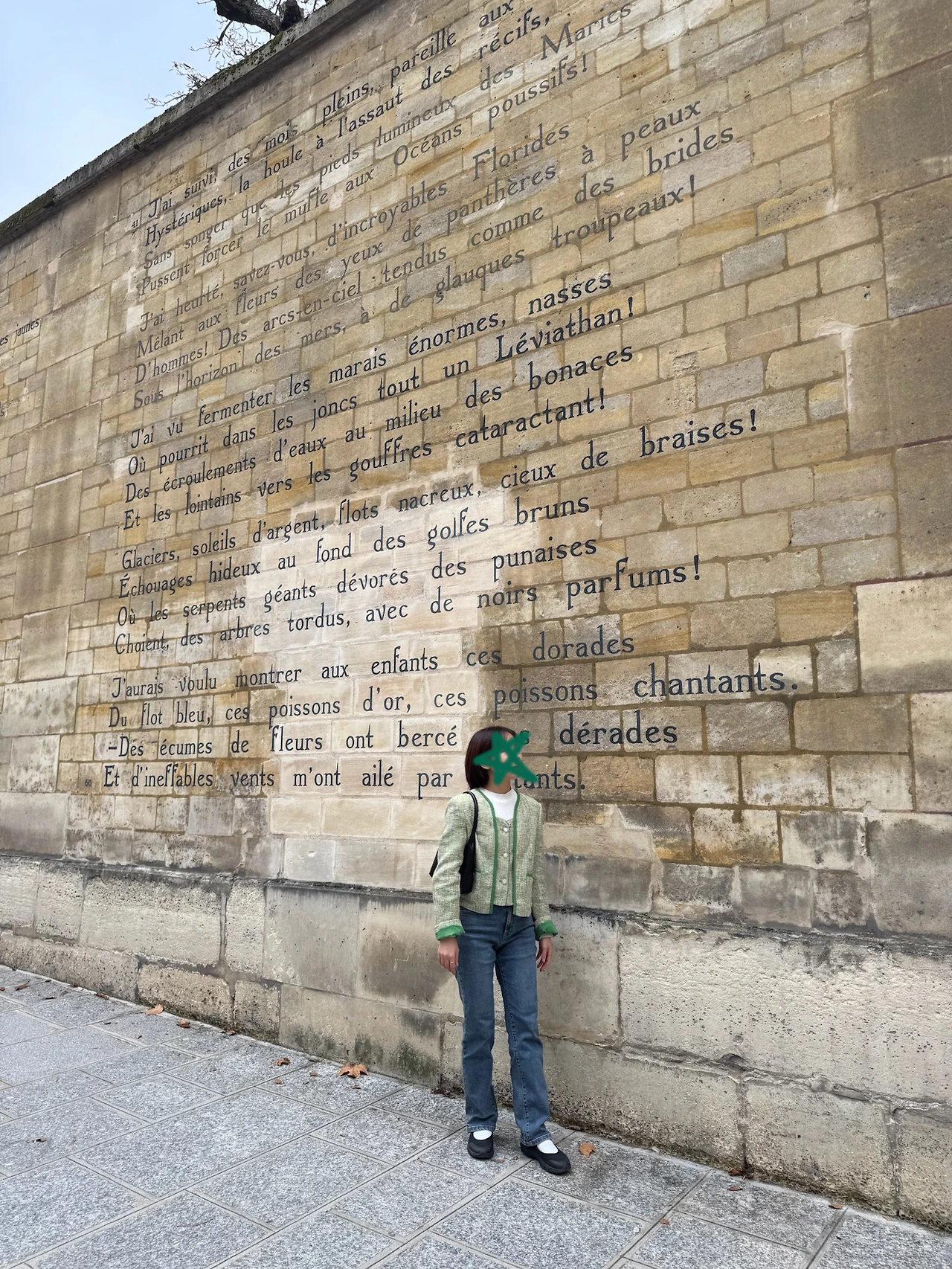 결국 동생은 탐탁지 않아 하며 랭보 취한 배 길로 향했는데, 이런 엄청 예쁘잖아. 무척 마음에 들어 안 왔으면 후회했을 정도다. 왜냐하면 사진이 정말 잘 나온다. 불만은 금세 사라지고 서로 열심히 사진을 찍어준다. 우리가 열심히 사진을 찍으니 지나가던 사람들도 "여기 뭐가 있나" 하며 벽을 쳐다보고 지나간다. 나는 이 와중에 동생한테 폰을 급하게 넘겨준 바람에 스트랩이 다 삐져나오게 찍어주고, 밤늦게서야 알아차리고 AI로 열심히 지워주기로 한다.