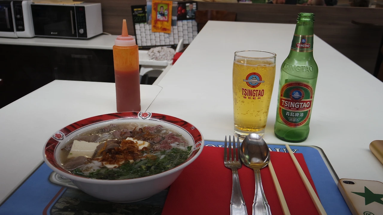 베트남 쌀국수다. 세상에! 여기까지 와서 굳이 베트남 쌀국수를 먹는 게 누가 보기엔 정말 이해 안 되는 행동일지도 모르겠지만, 이 때는 워낙 반가웠기에 '일단 저걸 당장 내 뱃속에 넣어야겠어'라는 생각밖에 안 났던 것 같다. 유럽을 여행하면서 거의 모든 한국 음식이 그리웠지만, 그중에 제일 먹고 싶었던 게 국물 요리였다. 밥 같은 경우는 마트에서 안남미(찰기 없이 흩어지는 쌀)을 사서 적당히 냄비밥을 해먹을 수라도 있지만, 국물요리는 영 찾기 어려운 것이었다. 그런 와중에 한국에서도 좋아했던 베트남 쌀국수가 뙇! 하고 있었으니 안 먹으면 안 되는 상황이었고, 그렇게 했다. 낮술도 아니고 아침술까지 곁들여서 일단 배를 빵빵하게 채워줬다.