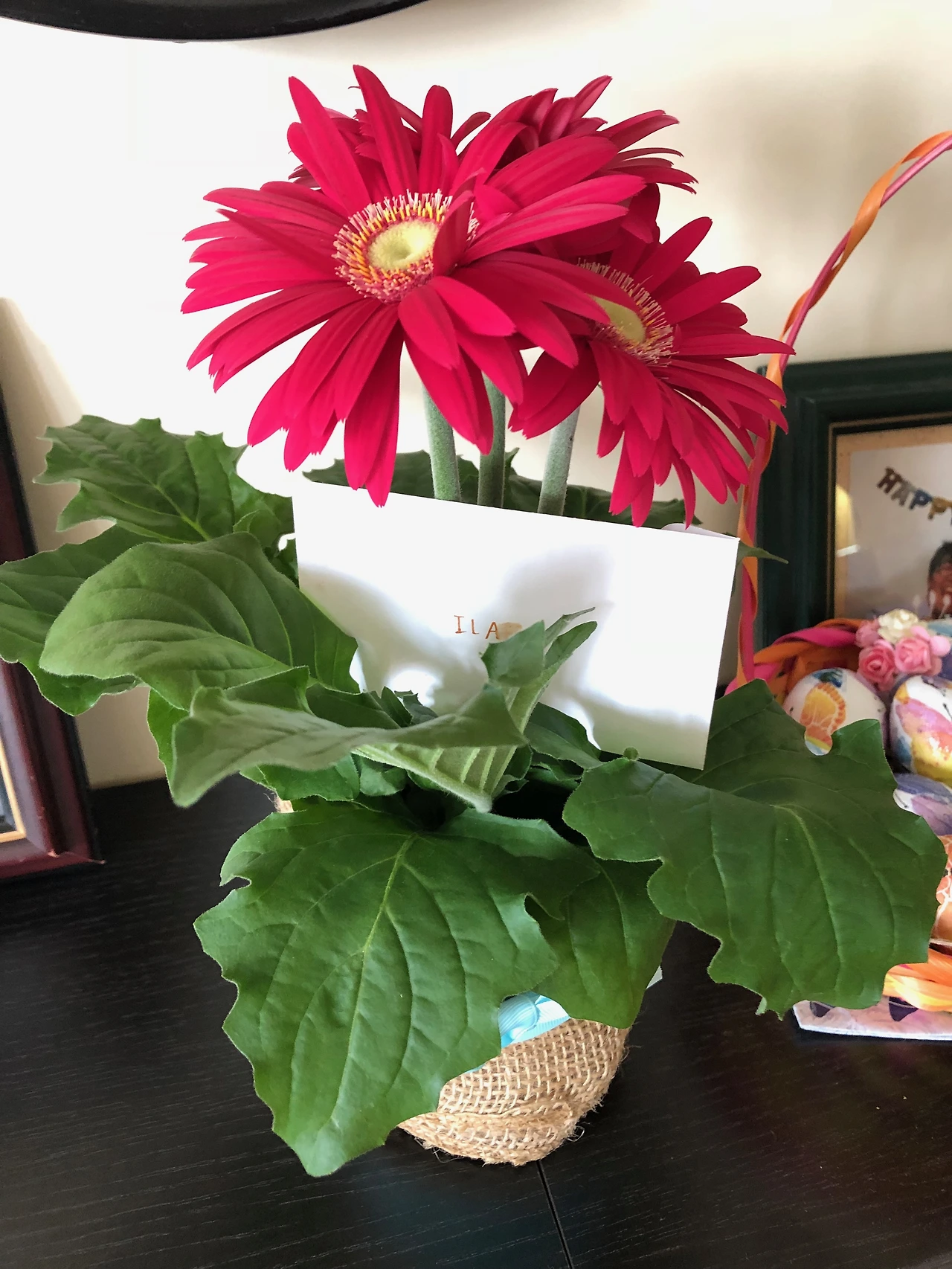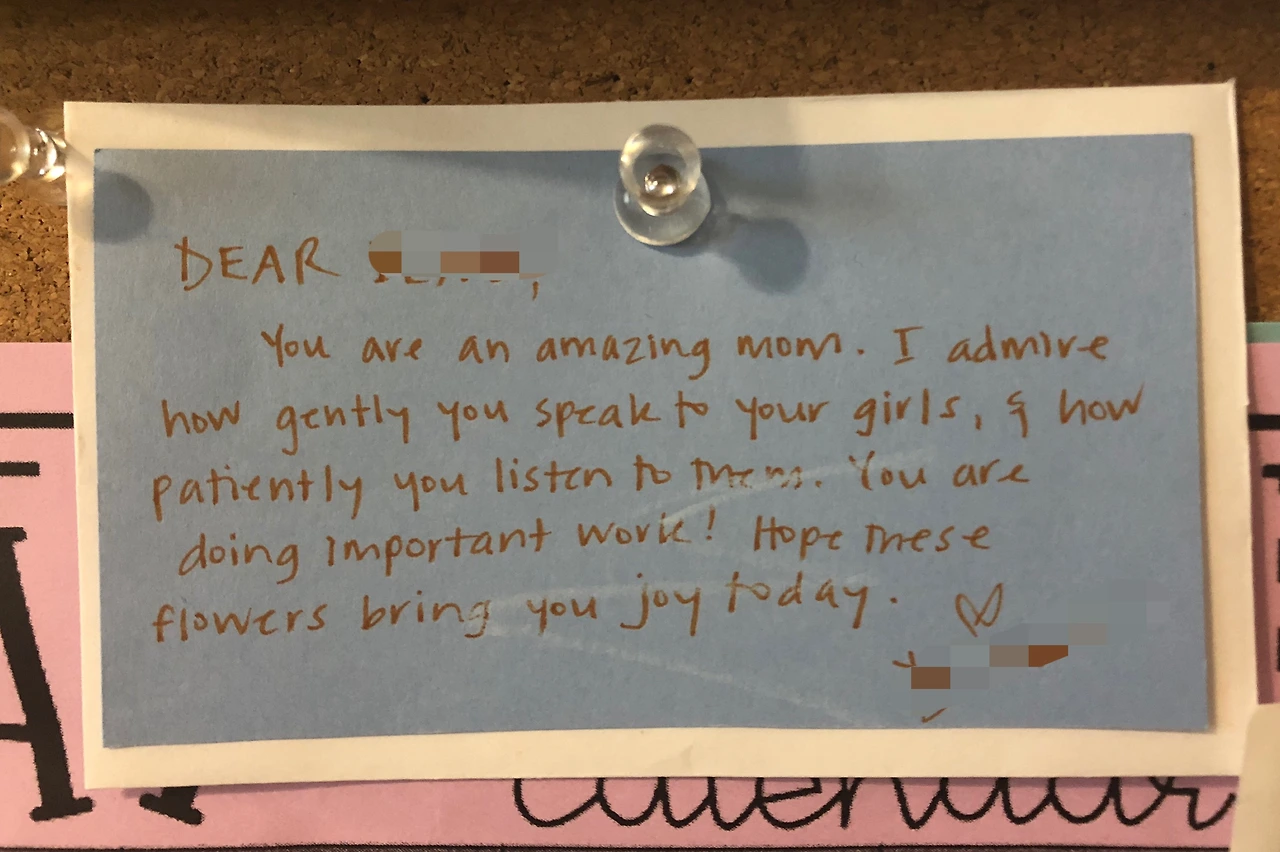 다음 날 누군가 현관문을 두드려 나가 보니 문 앞에 작은 꽃 화분이 놓여있다. 옆집 친구가 울고 있는 둘째를 안고 황급히 집으로 돌아가고 있다. 문이 열리는 소리를 들었는지 뒤돌아보고 눈을 찡긋한다. 일단 "Thank you!" 하고 들어와 카드를 펼쳐보고 눈물이 왈칵 났다.