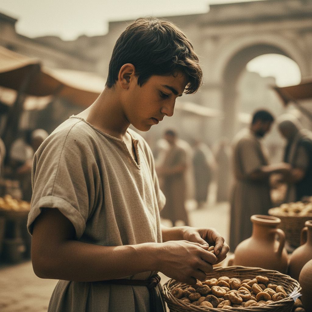 장사는 솔직히 쉽지 않아요. 큰형과 함께 말린 무화과와 올리브유를 파는데, 여기서 이윤을 남기기가 정말 힘들어요. 향신료나 비단 같은 고급 물품들은 우리랑 상관도 없고요. 아침 일찍 일어나 어두워지기 전까지 매대에 물건을 진열하고, 지나가는 사람들에게 큰 소리로 외치는 게 저의 일이에요. "달콤한 무화과! 올리브유!" 가끔은 며칠 동안 팔리지 않아 무화과가 돌덩이처럼 딱딱해지기도 하고, 암포라에 담긴 올리브유가 변색되기도 합니다. 시장 관리인이 시도 때도 없이 가격 단속을 하는가 하면, 시비를 걸거나 물건을 훔쳐 가는 사람들도 종종 있죠.