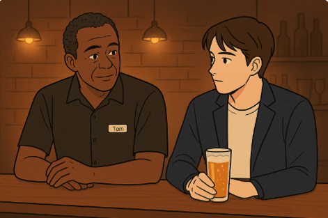 고개를 들자, 그 바텐더가 R을 향해 미소 지었다. 그의 명찰에는 작게 Tom이라 적혀 있었다.