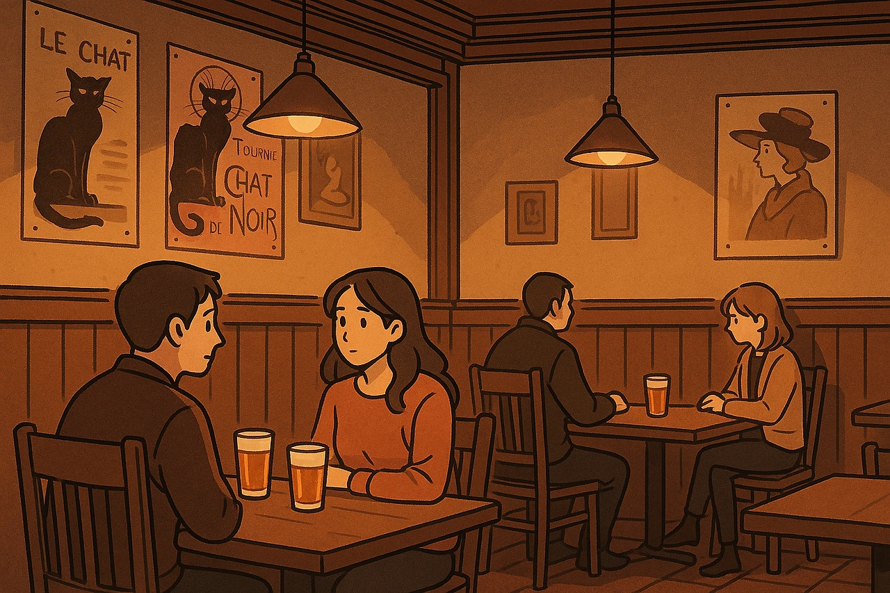 실내는 따뜻한 조명으로 은은하게 채워져 있었다. 탁자 위엔 반쯤 비워진 잔들, 벽에는 오래된 포스터들과 목재 장식이 나란히 걸려 있었고, 손님들은 서로를 방해하지 않는 거리에서 자기만의 속도로 머물고 있었다