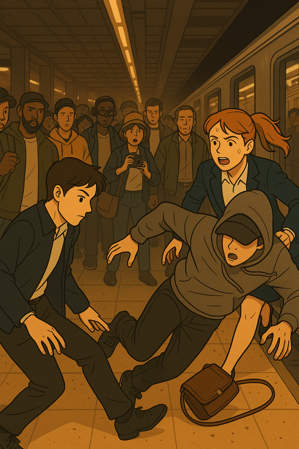 그 남자는 그대로 R의 발에 걸려 바닥으로 거칠게 넘어졌다. 그와 동시에 그의 손에서 여성의 가방이 쏟아졌다. 주변 사람들은 놀라움에 잠시 얼어붙었고, 그 여성은 허겁지겁 달려왔다.