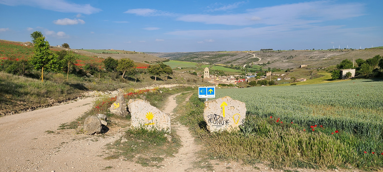 오르니요스 델 까미노엔 오랜 세월 비바람으로 풍화된 고풍스런 벽돌 집들이 줄지어 있다. 고택 처마 밑에 둥지를 튼 새들이 지저귀는 싱그러운 소리가 운치를 더한다. 언제 들어도 활력을 북돋우니 반갑다. 바삐 나는 새들은 환송의 합창을 보내는데 떠나는 나그네의 발걸음이 한가롭다. 고즈넉한 분위기에 발을 떼기가 주저되나 보다.