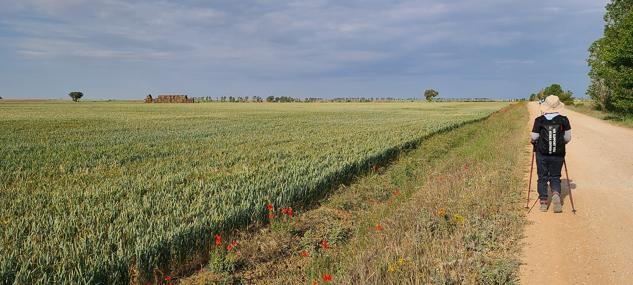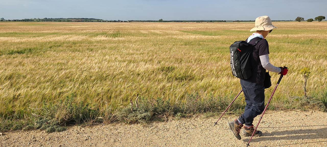 아무리 평지라 해도 17km를 내리 걷는 부담이 전혀 없을 순 없다. 하지만 마음을 달리하면 부담될 거리도 아니다. 어차피 걸을 길 목적지까지 26.3 km. 천천히 가도 6시간이면 충분하다. 중간에 서너 번 쉰다 해도 넉넉잡아 8시간이다. 험준한 산을 힘들게 8시간 종주하는 것에 비하면 옆 동네로 마실 가는 난이도이겠다. 논스톱 거리가 주는 착시와 부담을 잊기로 했다. 막상 걸어 보니 정말로 거리가 문제는 아니었다. 정작 다른 게 떠돌이 나그네의 발목을 잡아 끌었다. 바로 태양의 나라를 온통 불태우려는 본색을 드러낸 강렬한 햇살이다. 일출 직후 기온은 19도. 쌀쌀하던 아침이 얼마 지나지 않아 더워지기 시작했다. 정오가 아직 멀었지만 구름이 걷히니 작열하는 뙤약볕이 매섭다. 5월 말 메세타 고원의 평균 기온은 섭씨 20도 내외. 비교적 낮은 온도에 태양이 이다지도 뜨거운 이유가 궁금하다. 걸으며 챗 지피티Chat GPT에 물었다. 우선 태양의 고도와 각도 때문이다. 스페인 북부는 5월 말부터 태양 고도가 높아진다. 머리 위에서 직사광선이 수직에 가깝게 떨어져 햇살 강도가 매우 강하게 느껴진다. 건조한 공기와 맑은 하늘 역시 톡톡히 한 몫 한다. 구름이 적고 습도가 낮아 구름과 공기 중 수분이 태양광을 차단하거나 산란시키지 못해 피부가 태양광에 그대로 노출된다. 심한 경우 선크림을 발라도 피부에 화상을 입는다. 지나치는 순례자들이 이따금씩 나를 마스크맨이라 불러도 스포츠 버프를 포기하지 못하는 까닭이다.