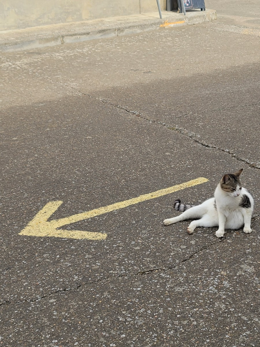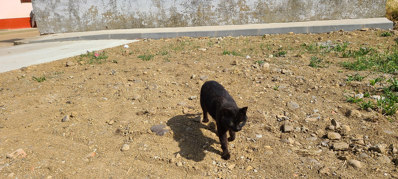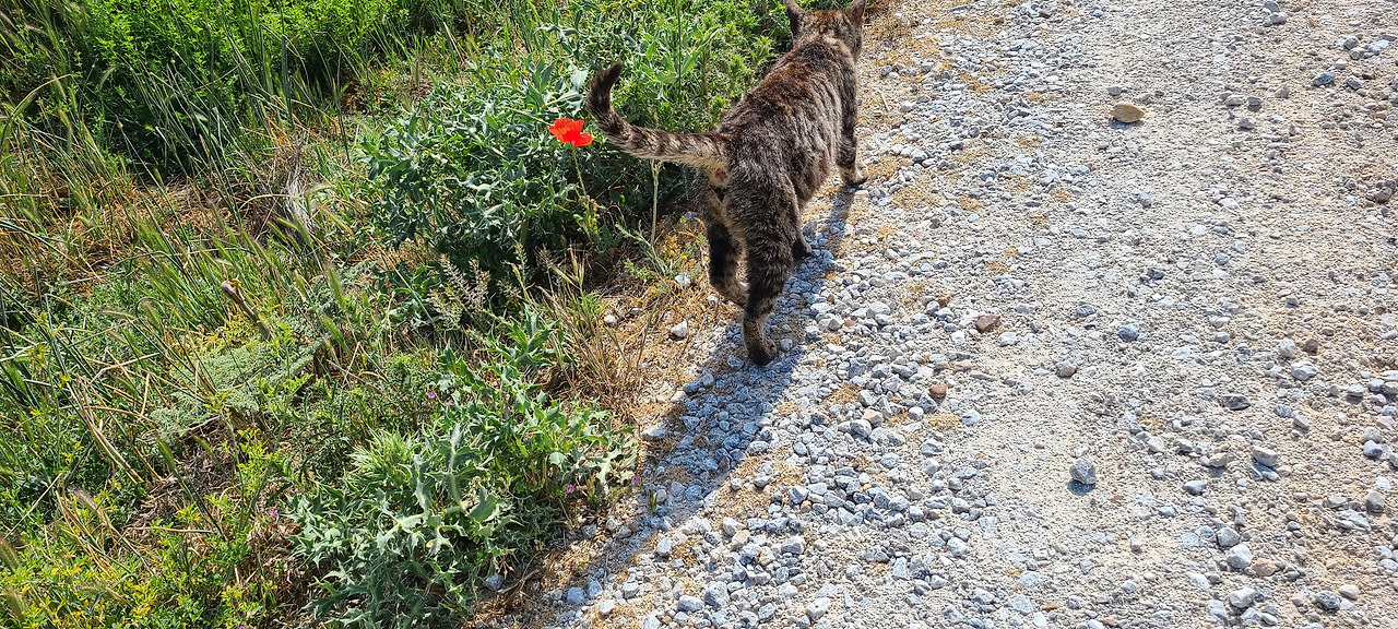 드디어 칼사디야 데 라 쿠에사에 도착했다. 유일하게 바가 있는 마을이다. 마을에 들어서기 전, 방문객을 환영하는 길냥이 두 마리를 만났다. 짙은 고동색 고등어와 검은색 깜냥이다. 마을 초입의 바를 지나쳤다. 다음 번 바에서 쉴 작정이었는데 마을이 끝나가도 통 보이질 않는다. 되돌아가기 귀찮아 그늘을 찾아 아무 담벼락 밑에 들어갔다. 길 한복판 노란 화살표에 앉아 놀던 밤색 얼룩이 한 마리가 슬금슬금 다가온다. 뭔가 얻어먹을 심사 같은데 마땅한 간식거리가 없다. 한두 살쯤 되려나? 사람 손을 탄 귀여운 녀석이다. 하쿠 생각도 나고 챙겨줄 게 없어 미안한 마음에 조금 쓰다듬어 주었다.