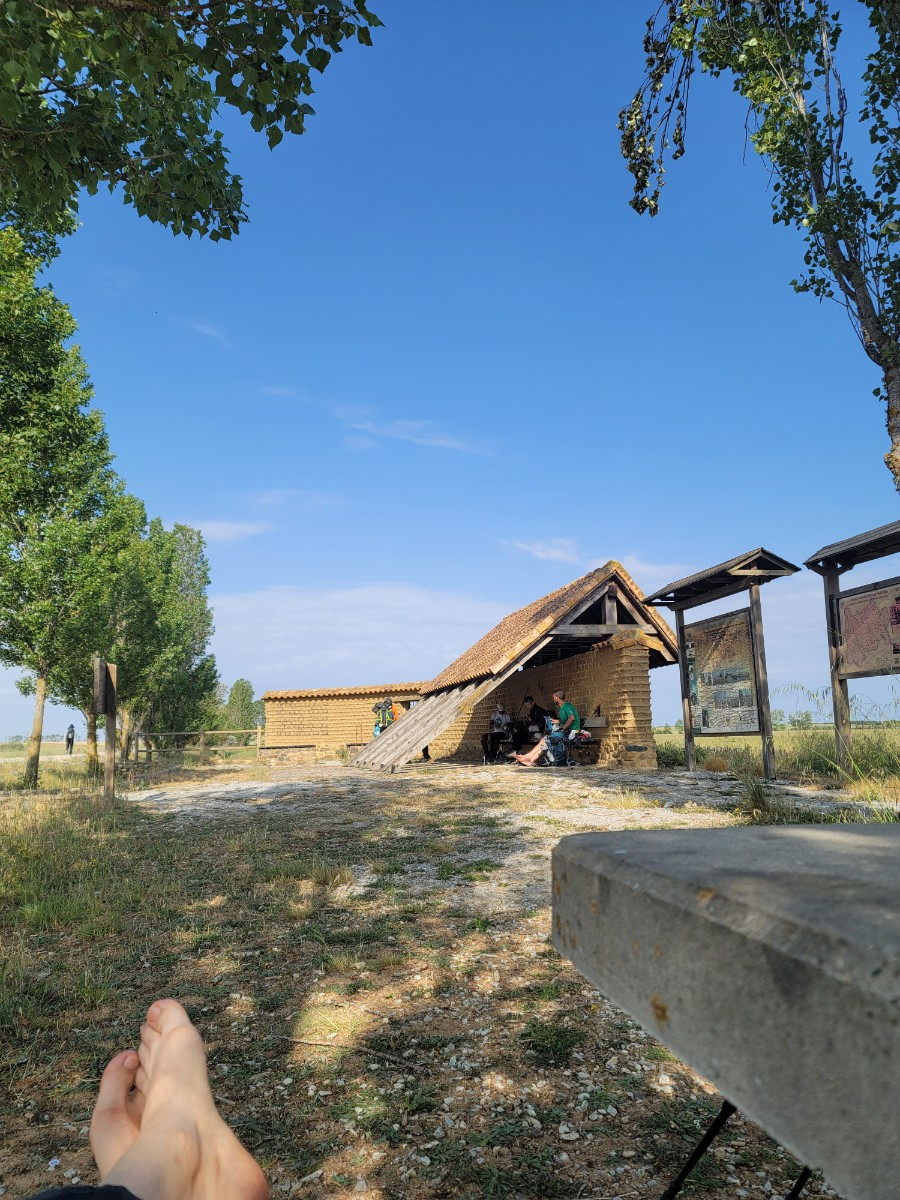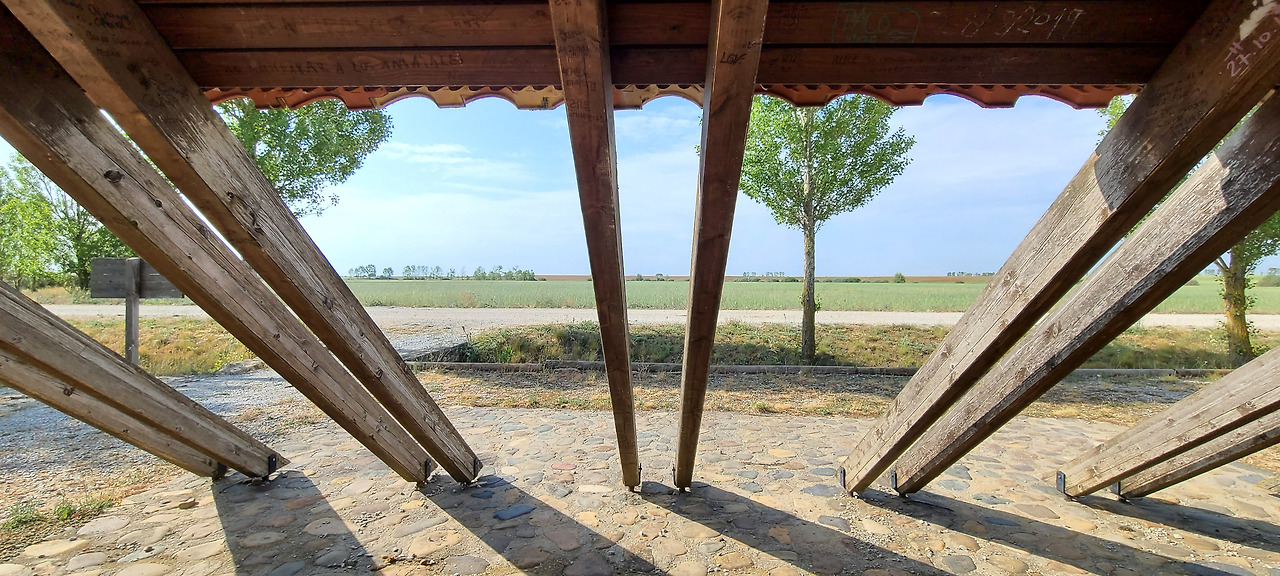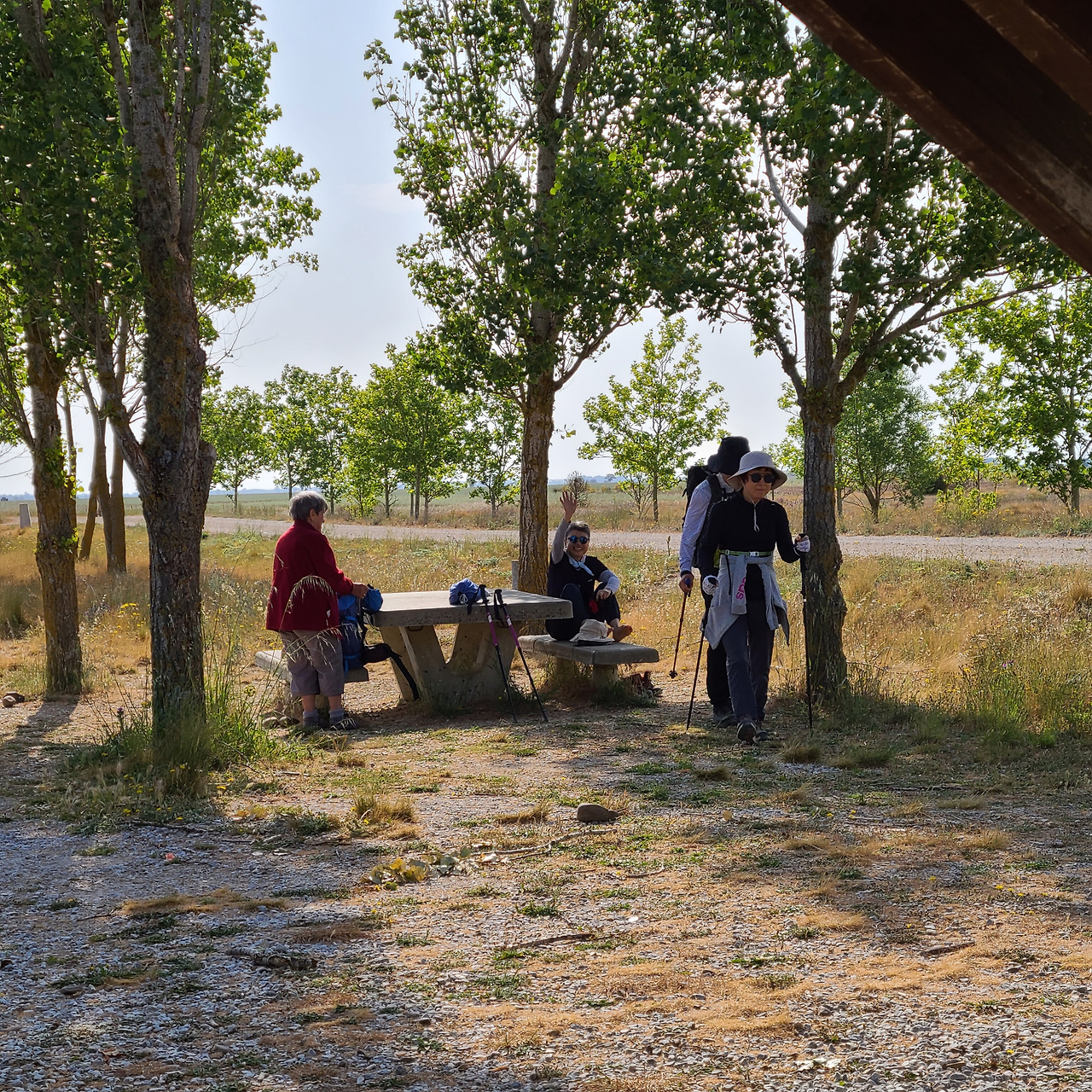 1시간 반을 걸었을까? 오른쪽에 그늘집이 보였다. 순례자를 위해 마련된 휴게소였다. 이제 겨우 9시 54분인데도 해가 뜨겁다. 쉬고 싶던 차에 뜻밖의 오아시스가 이루 말할 수 없이 반가웠다. 척박하게 메마른 사막 같은 삶이라면 부르트고 갈라진 입술을 적실 단물이 그립기 마련이다. 푸른 수풀에 둘러싸인 오아시스에서 마음껏 물장구치며 해갈하는 자신을 상상해 보라. 상대방이 죽어라 판을 키우고 무표정한 블러핑이 남발하는 포커판 같은 무한 경쟁의 지옥에서 벗어난 환희를 만끽할 것이다. The Staple Singers는 'I’ll take you there (276위)'에서 근심걱정 없이 자비가 가득한 오아시스 같은 그곳으로 데려다 주겠다고 노래한다. 그늘막에 들어가 열기를 식혔다. 이왕 쉬는 거 누나는 양말을 벗어 발을 말리더니 나무 아래 돌 벤치에 드러누웠다. 햇살이 강렬해도 습하지 않아 그늘 아래는 시원하다. 차가운 의자에 누워 편하게 피로를 푸시는 것 같았다. 까미노에서 만난 오아시스가 그러했듯이, 인생에서 마주친 오아시스가 그랬던 것처럼 사회 안전망이 촘촘히 마련된 낙원에서 사회적 약자들에게 안식을 제공한다면 얼마나 좋을까 하는 공상을 했다. 푸드 트럭에 뵌 부부가 누나에게 다가와 환담을 잠시 나누고는 먼저 오아시스를 떠났다. 이렇듯 까미노는 앞서거니 뒤서거니 함께 어울리는 길이다.