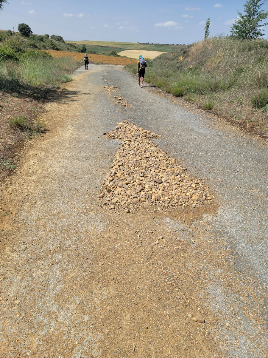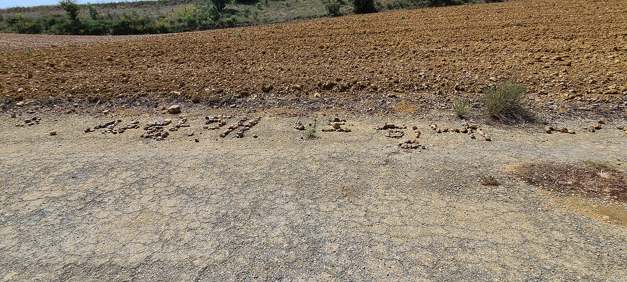 언덕을 내려온 지 10분도 되지 않아 다시 길이 갈라진다. 좁다란 길로 접어드는 내리막길에 조약돌로 수놓아진 한글이 보였다. '사량해 여보 힘내'. 이 문구를 새긴 이는 배우자와 함께 걸었을 것이다. 17.2km의 논스톱 길에 지친 배우자에게 힘내라며 애썼을 모습이 눈에 선했다. 기진맥진하던 배우자가 사랑이 한가득 담긴 메시지가 새겨지는 광경을 보며 얼마나 감격했을까? 아침에 손잡고 사이좋게 걷던 부부가 다시 떠올랐다. 그들도 서로 의지하며 한 걸음씩 나갔을 것이다. 어찌 보면 남남으로 태어나 인생의 한 길을 같이 걷는 무촌지간의 인연이 까미노에서 흔히 만나는 인연들과 꽤 비슷하다 여겨진다. 차이점이 있다면 부부는 평생을 희로하며 동행하지만 순례자들은 목적지가 같아도 스쳐지나는 짧은 우연일 뿐이라는 것.