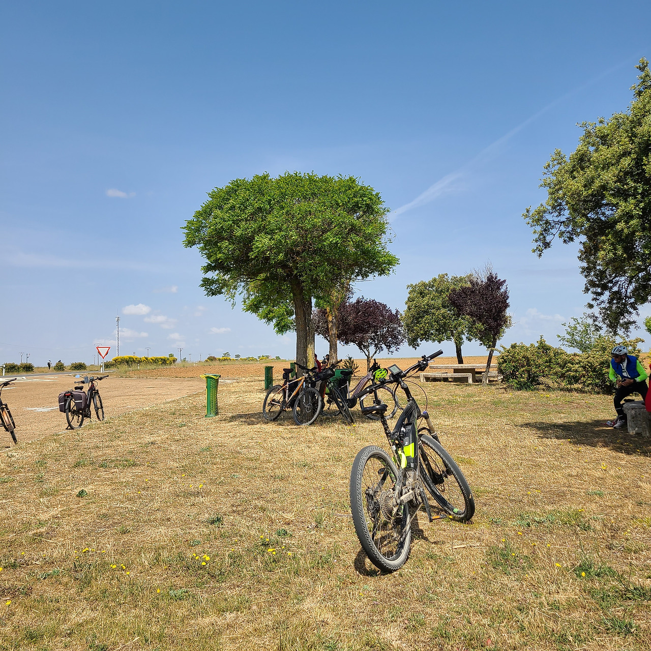 산타마리아 데 라스 티엔다스Santa Maria de las Tiendas 근방에서 다시 도로를 만났다. 차도 건너편 자그만 언덕 위에 쉴 곳이 보였다. 무성한 나무 그늘은 선객들 몫이다. 이탈리아 출신의 MTB 순례자들이다. 주로 차도와 비포장 평지 위주로 다니되 산길은 우회한다고 설명한다. 푸엔테 라 레이나에서 만난 천사 아주머니도 우회도로를 이용한다고 했다. 하지만 고수 라이더들은 좁고 험한 산길도 풀샥 MTB를 타고 넘는다. 도보 순례자들이 걷는 프랑스 루트를 똑같이 완주한다. 나도 자전거를 즐기는 편이나 자전거 전용도로나 한산한 공도를 달리거나 기껏해야 잘 닦인 임도를 업힐 하는 정도다. 산악용 MTB로 거친 산길로 순례하는 게 엄두가 나지 않아 부러웠다. 라이더들이 사고 없이 산티아고에 이르길 축원했다. 정오를 넘겨 뱃속이 허전하다. 행동식으로 복숭아와 감자칩을 먹었다. 당분과 염분을 보충하고서 다시 길을 나섰다. 남은 거리는 4km가 못 되었다.