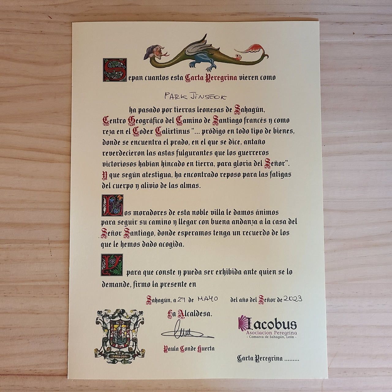 산티아고 순례길 절반을 걸었다. 이를 기념하려고 사아군Sahagún의 순례자 성모 성지Santuario de la virgen peregrina 박물관에서 반주증을 발급받았다. 절반을 완주했다는 공식 인증서는 아니다. 성지 박물관을 방문했다는 증서의 문구 중 산티아고 순례길의 중심절반인 레온의 땅 사아군을 통과했다는 글귀가 있어 흔히 반주증이라 부른다. 정식 인증은 아니지만 흐뭇했다. 780km를 어느 세월에 걷나 싶었는데 하루하루 지나 벌써 절반에 이르렀다. 성당이 보이는 카페 마당에 앉아 우보만리의 덕업을 쌓고 우공이산 하듯 읽은 책으로 산을 쌓았으면 어땠을까 하는 부질없는 상상을 했다.