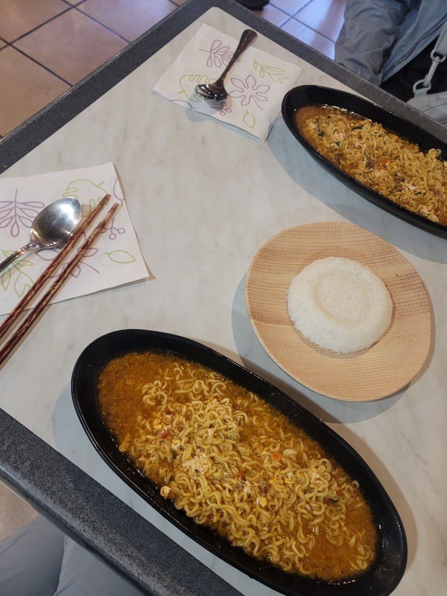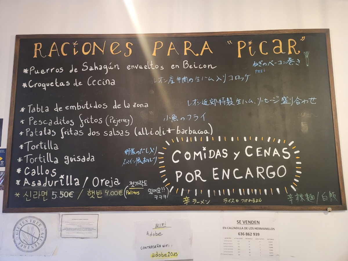 야외 테이블은 MTB 순례자들로 만석이었다. 주차된 자전거가 간판을 가려 여긴 아니겠지 하고 지나치려던 순간, 분필로 적은 입간판에 ‘신라면 + 햇반’이라는 한글이 반갑게 시선을 잡아끈다. 옳다구나, 여기로구나. 누나를 가게 안으로 끌었다. 아침에 라면 괜찮지라는 물음에 누나도 반색했다. 그런데 자리가 없다. 어제 만난 한국인 젊은 여성 순례자가 자기는 다 먹었다며 합석을 권했다. 고맙다는 인사를 건넸다. 그녀는 방금 식사를 마친 상태다. 라면을 주문하고 돌아와 그녀와 짧은 한담을 나누었다.