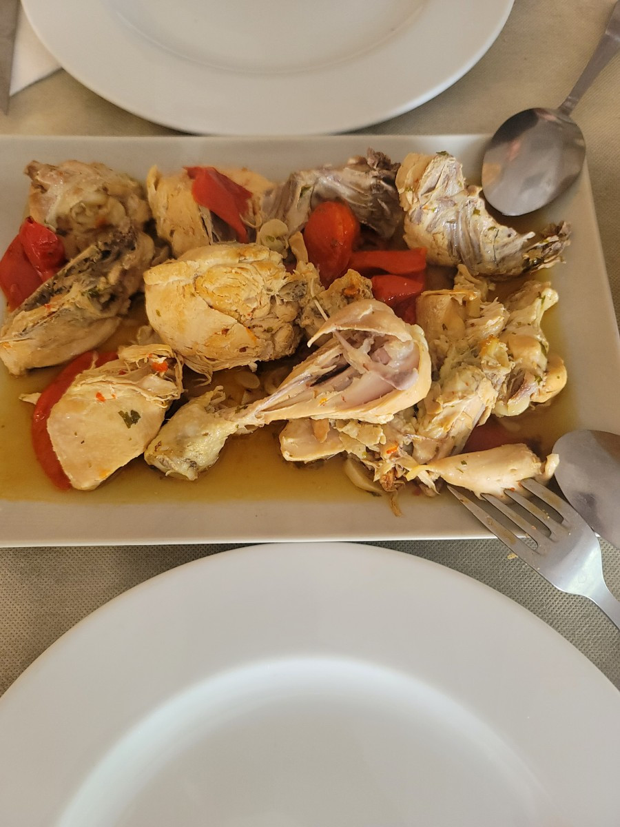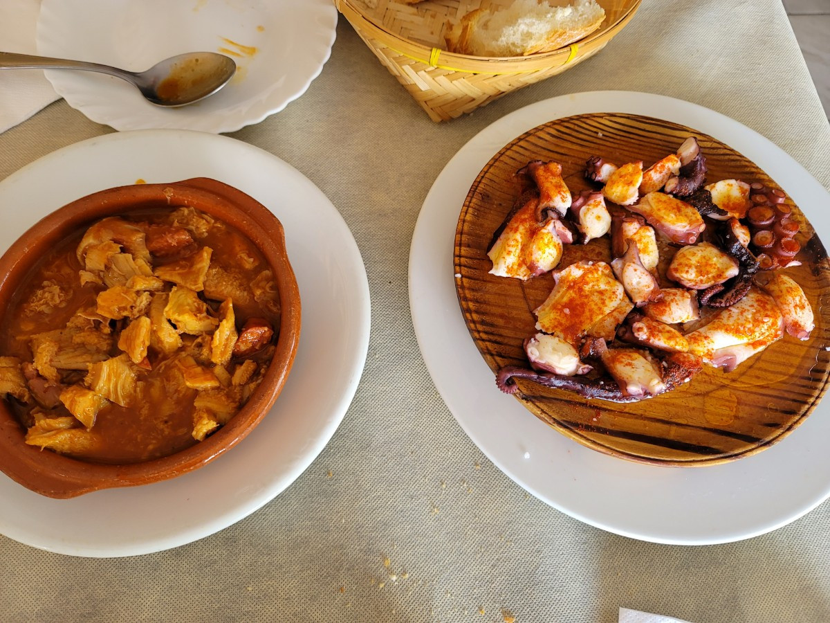 점심 메뉴를 고민하다가 구글 검색을 했다. 햄버거와 샌드위치가 당겨 평점이 높은 카사 토노Casa Tono에 갔다. 그런데 점심은 메뉴델디아 풀코스만 가능하단다. 가격은 저렴한 편이지만 라면을 거하게 먹은라 풀코스가 부담스러웠다. 풀코스와 단품 메뉴를하나씩 주문 가능한지 부탁했는데 매정하게 안된단다. 메뉴델디아 2인분을 주문해 먹다 남길까 하다 내키지 않아 가게를 나왔다. 숙소로 돌아오면서 영업중인 가게를 찾았다. 적당한 평점의 라 라구나La Laguna에 들어갔다. 가게가 한산했다. 우리가 유일한 손님이다. 무료한 표정의 아주머니가 반갑게 맞이한다. 문어 요리인 뽈뽀Pulpo와 스페인 전통 스튜인 카요스Callos를 주문했다. 요리가 나왔다. 뽈뽀는 먹음직스러웠다. 그런데 카요스는 아니었다. 우리로 치면 소내장탕과 비슷하게 기름진 데다 향과 맛이 입맛에 맞지 않았다. 누나도 마찬가지였다.
