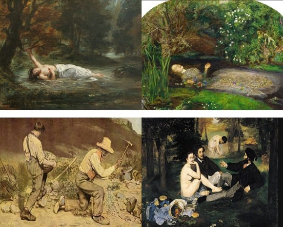 들라 크루아와 존 에버렛이 그린 오필리아의 죽음은 햄릿의 연인에 대한 이야기를 담고 있습니다. 사실주의는 보편적 인물들을 사실대로 그리는 것에 무게중심을 두었습니다. 쿠르베 돌깨는 사람은 석공의 노동을 생생하게 묘사합니다. 인상파 마네의 풀밭 위의 점심식사를 보면 이전 작품들과 사뭇 다릅니다. 그늘과 햇빛을 대비시켜 화가가 느낀 감정을 표현하고자 하였습니다. 빛과 색을 대비시키는 이러한 화법은 당시 프랑스 미술계에서는 생소한 기법이었다고 합니다. 얼핏 무신경하게 세밀히 그리지 않은 듯하게 보입니다. 여인의 누드에 직접적 관심을 두지 않도록 천사, 아기들로 위장하지 않고 남성 바로 옆에서 나신을 드러내어 외설 논란에 휩싸여 혹평을 받게 됩니다.