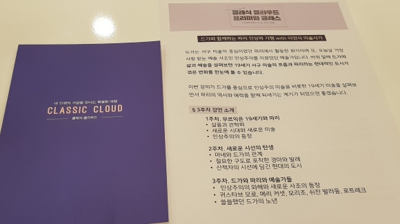 제가 신청한 강좌는 프랑스 인상파 드가입니다. 강사는 미술사가인 이연식 작가입니다. 클래식 클라우드 시리즈는 18년 9월부터 미술, 음악, 문학 등 예술분야 인물을 정하고 이를 소개할 전문가가 현지답사한 결과물을 출간, 강연하는 인문학 강좌입니다. 드가 강좌는 13번째로 1년이 지나 다시 미술부터 시작한다고 합니다.