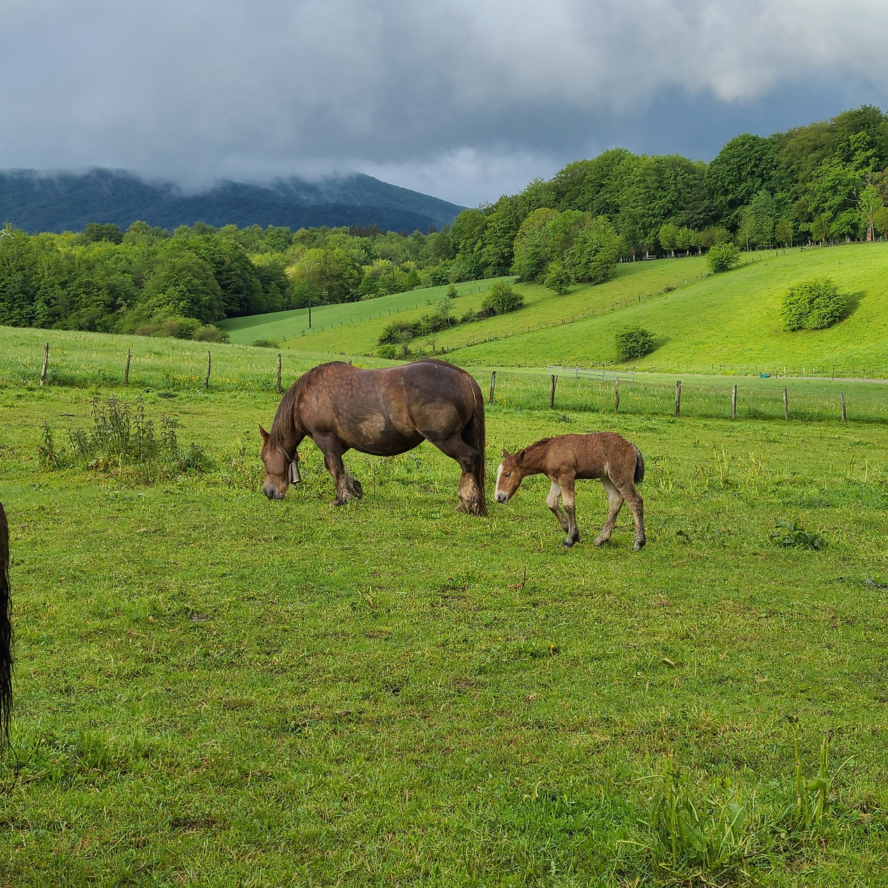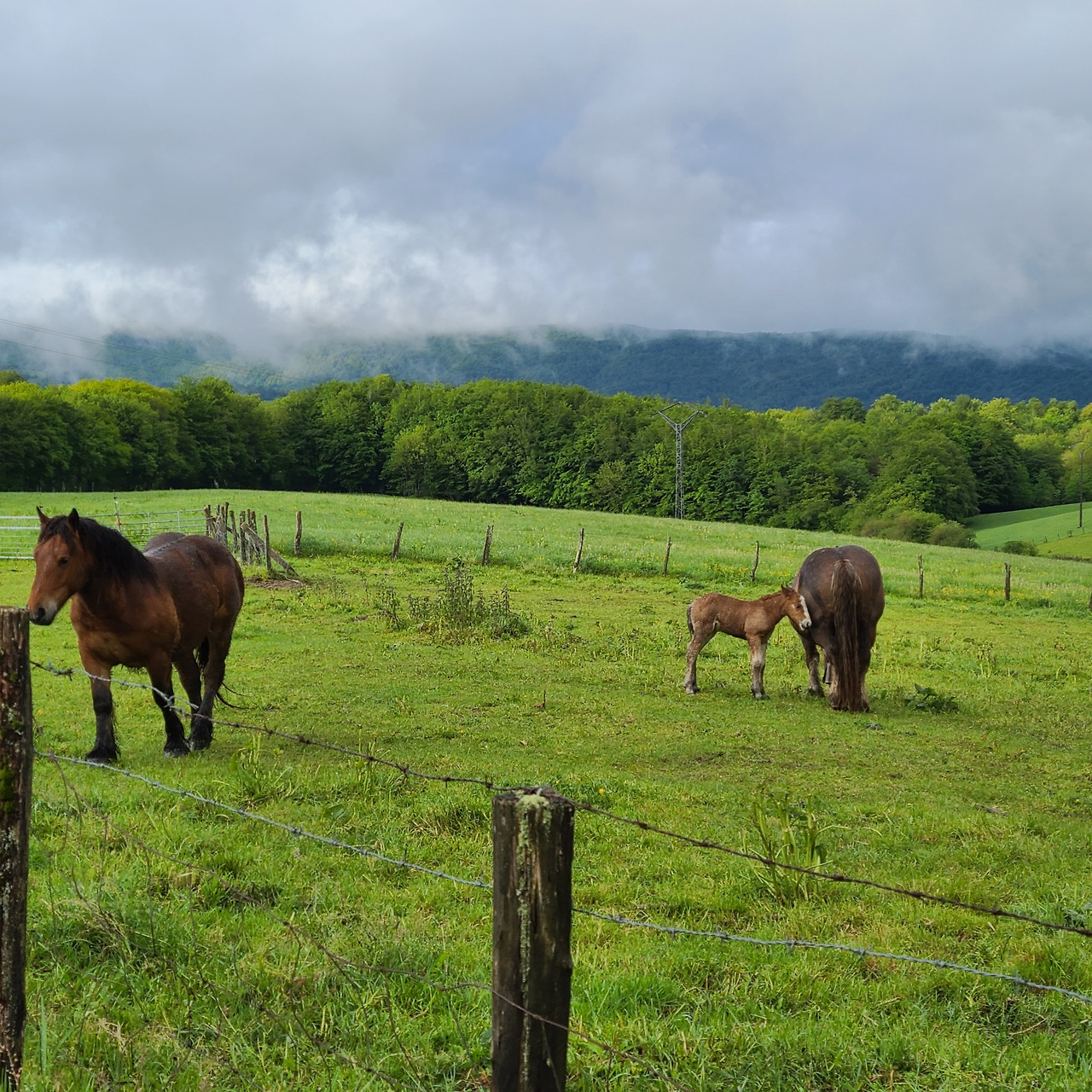 아직 쌀쌀한 아침이다. 어제처럼 짐을 꾸려 배낭을 메고 출발하려는 찰나에 이슬비가 흩뿌린다. 우비와 라텍스 비닐장갑을 착용한 다음에 길을 나섰다. 페레그리노스 알베르게 Algergue de Peregrinos 광장 앞 표지판에 산티아고 콤포스텔라까지 남은 거리가 790km라 적혀 있다. 프랑스 루트의 공식 인증거리는 779km. 어제 24km를 걸었으니 755km가 남았을 텐데 의아했다. 자동차 도로 기준이겠지 하며 넘겨버렸다. 이정표 오른편 너른 풀밭에서 어미말과 망아지들은 부산스레 출발하는 순례객들이 안중에 없다. 궤념치 않고 한가로이 풀을 뜯어 먹는다. 초원을 노니는 말. 내가 상상하던 목가적 풍경 중 한 장면이다.