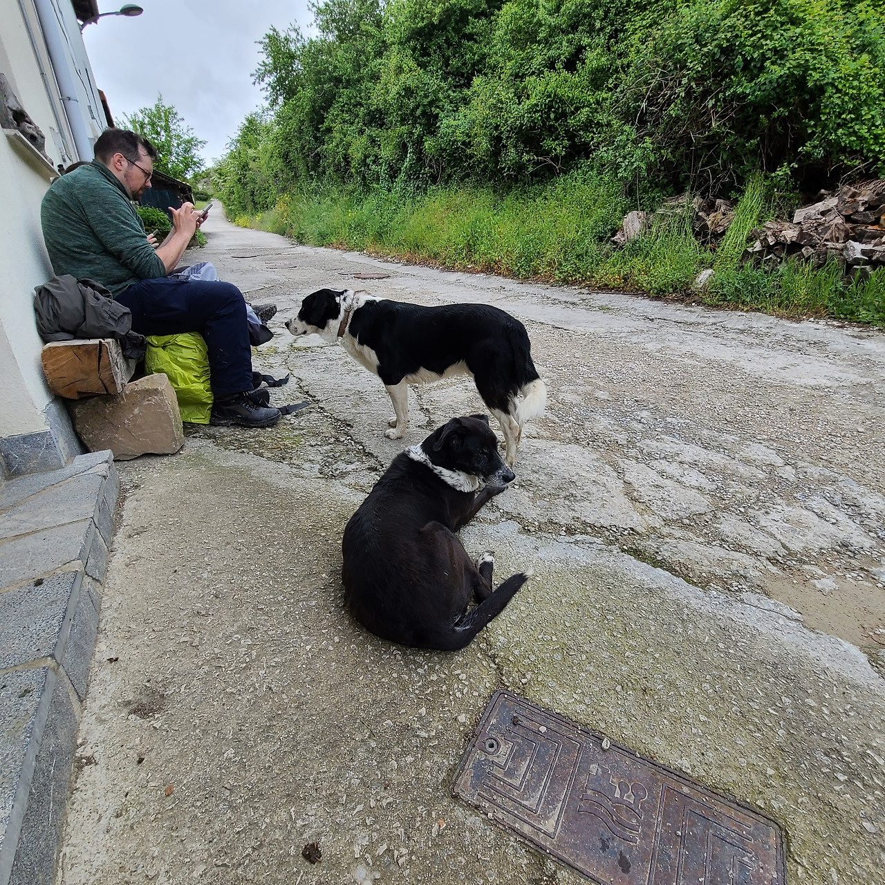 적당히 앉을 만한 곳을 찾았다. 연인으로 보이는 젊은 남녀가 언덕길이 막 시작되는 주택가 앞에 놓인 기다란 의자에서 쉬고 있다. 얼핏 봐도 덩치 큰 리트리버 두 마리가 연인들에게 먹이를 달라며 꼬리 친다. 우리 남매는 개를 무서워하는 편이다. 그냥 지나려다 용기를 내 연인 옆 자리에 앉았다. 앞으로 쉬기 적당한 곳이 있으리란 보장이 없거니와 만의 하나 개들이 덤비면 옆에 앉은 청년에게 의지할 생각이었다. 그런데 멀리서 볼 때와 달리 눈방울이 동글동글한 게 무척 순해 보였다. 평소 지나가는 순례자들에게 먹이를 자주 얻어먹어 그런 거 같다. 우리에게도 바짝 다가와 사뭇 살갑게 굴며 먹이 달라 칭얼거린다. 순간 솜털이 돋고 등골이 살짝 오싹해진다. 그래도 겁먹은 티 내지 않고 바게트 몇 조각을 떼어 던져주었다. 게눈 감추듯 입에 털어 넣고는 한참을 더 달라며 우리 주위를 서성인다. 더 줄 게 없어 시선을 돌리자 멀찌 감치 다가오는 순례객들의 인기척에 그쪽으로 꼬리 치며 총총 달려간다. 그제야 마음 편히 남은 사과와 바게트를 주섬주섬 챙겨 먹었다.