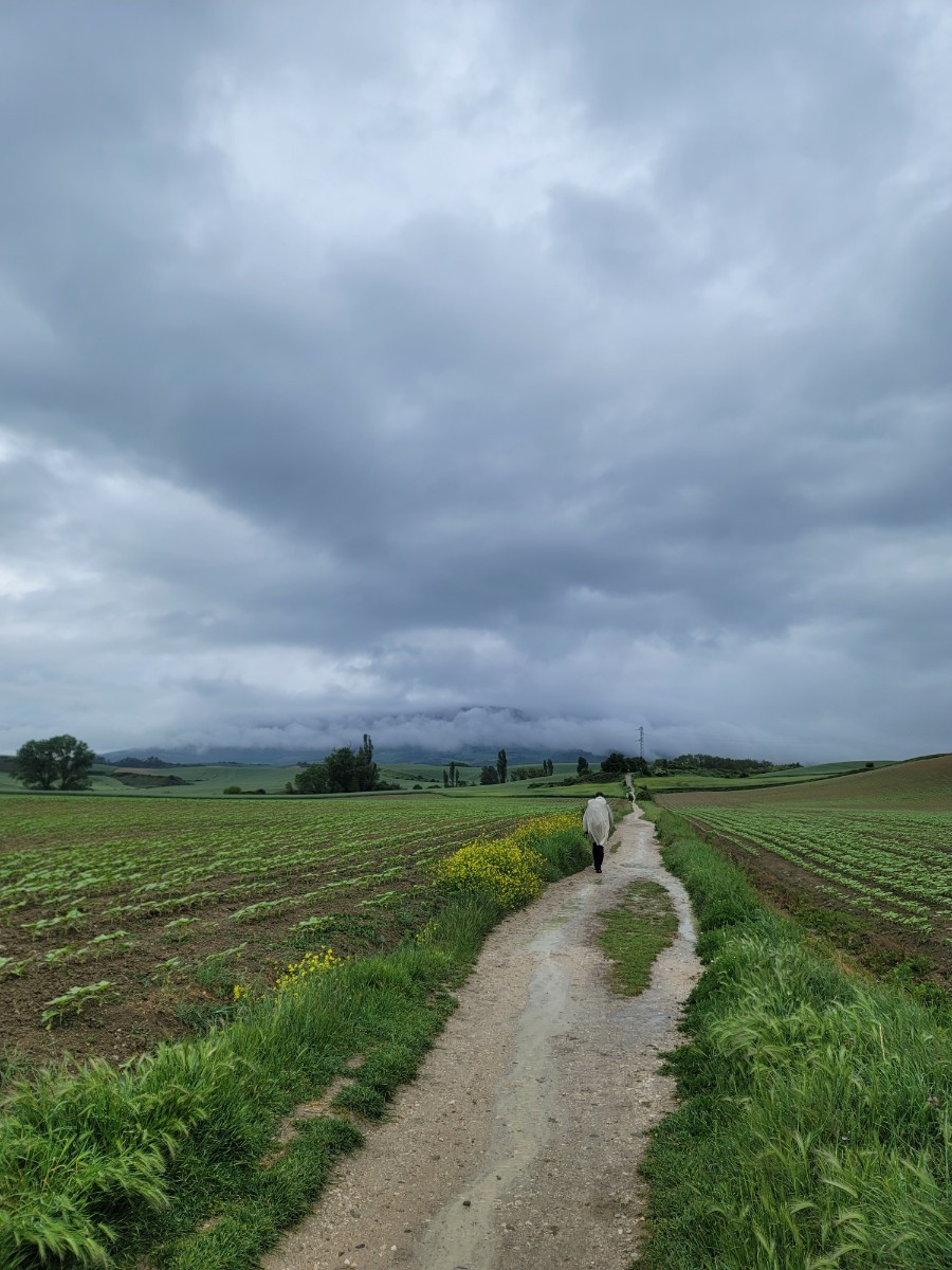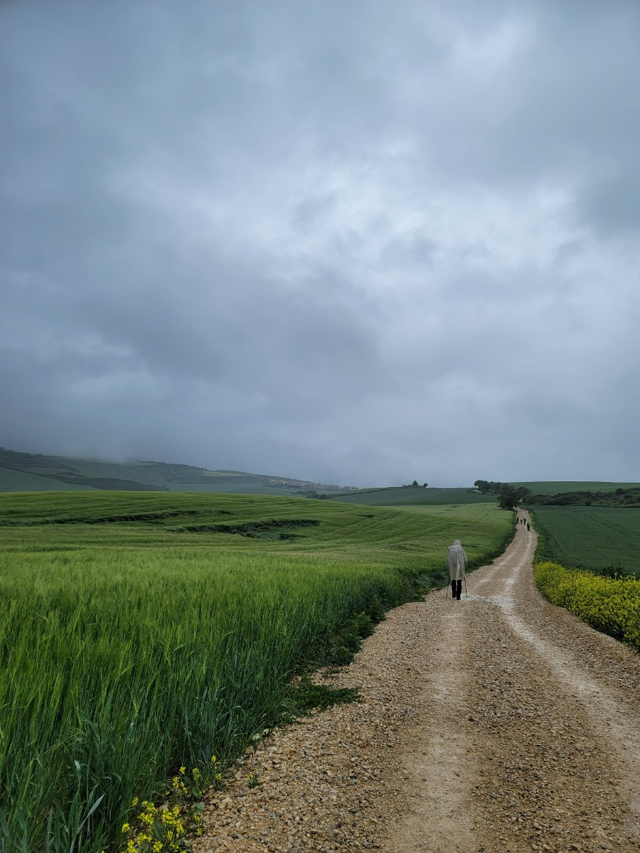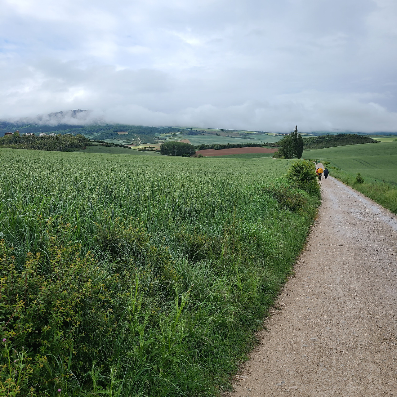 까미노를 걸은지 한 시간 반이 넘을 무렵부터 비가 조금씩 잦아들었다. 용서의 언덕Alto del Perdon에 오를 때까지 내리다 그치길 반복했다. 자길길에 흘러내리는 빗물이 뿌옇다. 석회석이 퇴적된 토양인가 보다. 노랗게 영그는 밀알을 가득 품은 초록의 밀대와 졸졸 흐르는 연회색 빗물이 대비된다. 구릉 사이에 낮게 깔린 구름과 녹색의 초원 사이로 까미노가 이어진다. 그 위로 몇몇 순례자들만이 자신의 길을 걸어간다. 얼마나 고즈넉하고 평화로운 광경인가!