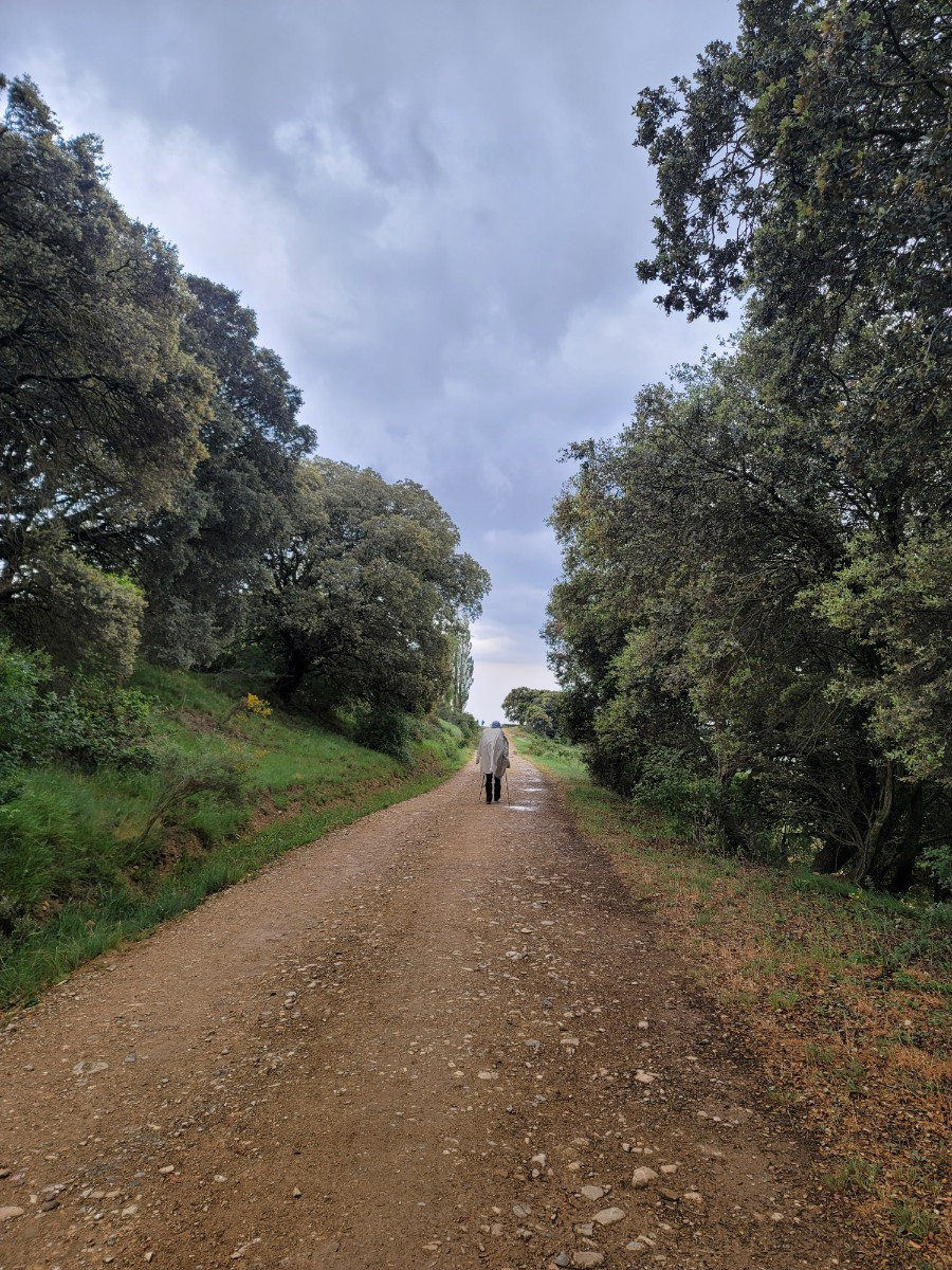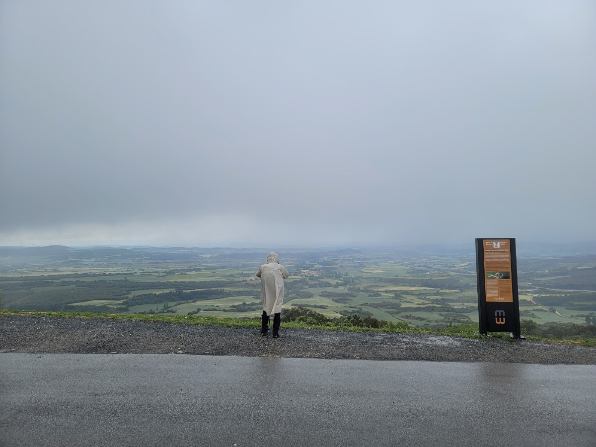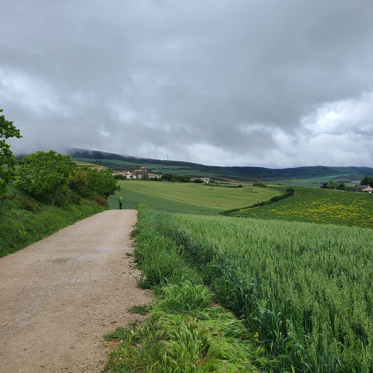 까미노를 걸은지 한 시간 반이 넘을 무렵부터 비가 조금씩 잦아들었다. 용서의 언덕Alto del Perdon에 오를 때까지 내리다 그치길 반복했다. 자길길에 흘러내리는 빗물이 뿌옇다. 석회석이 퇴적된 토양인가 보다. 노랗게 영그는 밀알을 가득 품은 초록의 밀대와 졸졸 흐르는 연회색 빗물이 대비된다. 구릉 사이에 낮게 깔린 구름과 녹색의 초원 사이로 까미노가 이어진다. 그 위로 몇몇 순례자들만이 자신의 길을 걸어간다. 얼마나 고즈넉하고 평화로운 광경인가!