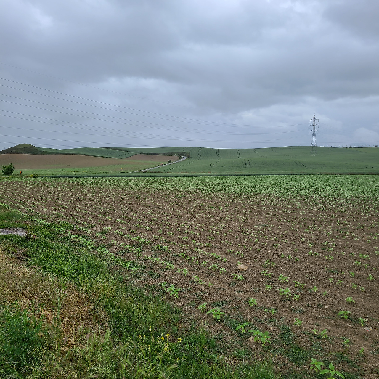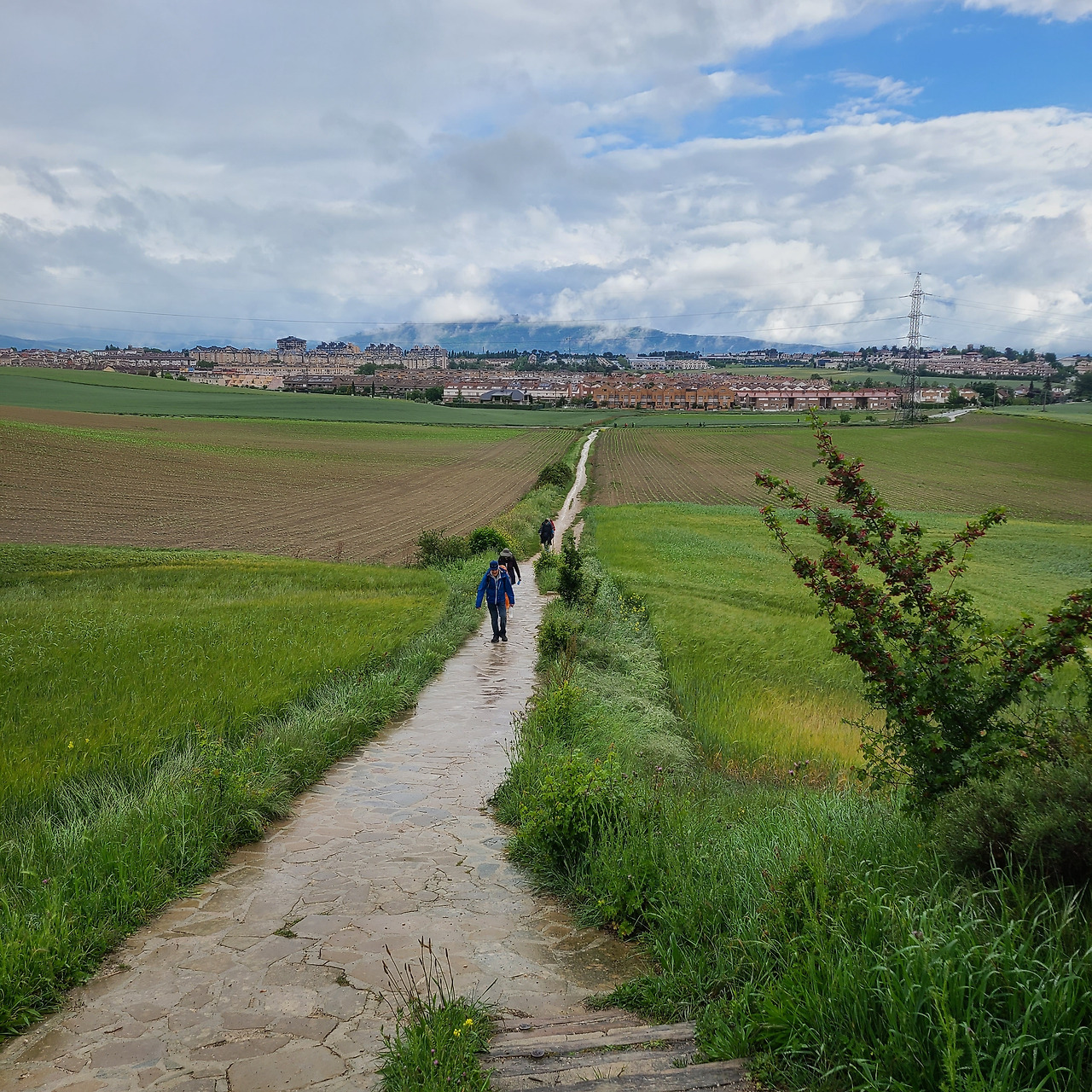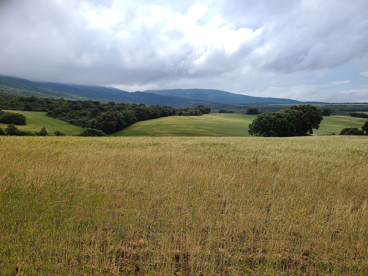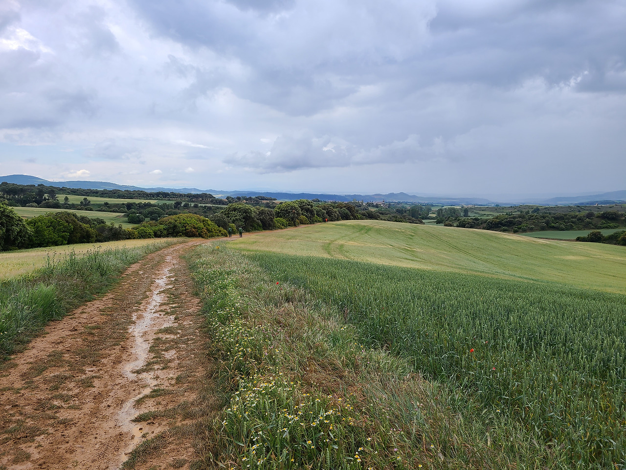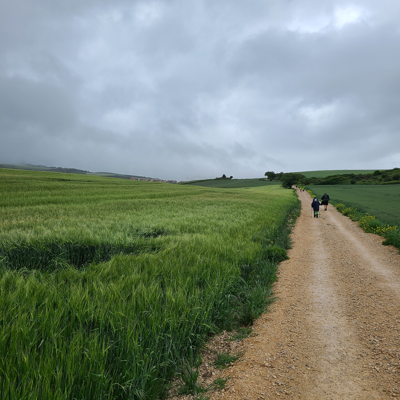 쏟아지는 비를 무릅쓰고 예정한 시간에 숙소를 나섰다. 숙소 주변이 번화가였나 보다. 토요일밤을 즐긴 취객들의 흔적이 인도에 가득했다. 너저분하게 어질러진 캔과 플라스틱 컵, 먹다 버린 안주를 피해 가며 조심스레 구도심을 빠져나왔다. 시내에서 팜플로나 시외를 가리키는 가리비 표식이나 까미노 화살표를 종종 놓치는 경우가 있다고 들었다. 앞선 순례자들을 따라 눈치껏 그리 어렵지 않게 교외로 접어들었다. 한 시간가량 빗길을 걸어 시수르 메노르Cizur Menor 마을에 도착했다. 비를 피해 요기도 할 겸 여기서 잠깐 쉬기로 했다. 아뿔싸, 주일 아침이라 용케 찾은 바가 문을 닫았다. 어찌할까 고민하다 버스 정류장에서 비를 피했다. 벤치에 앉아 챙겨온 빵과 사과로 브런치를 대신했다. 시수르 마요르Zizur Mayor를 지나자 광활한 구릉지에 온통 밀밭이 가득 들어섰다.