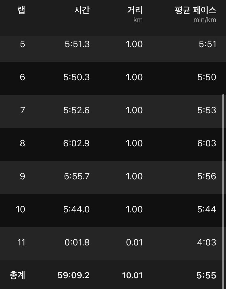 한 시간 안에 10km의 거리를 완주하기 위해 집중해서 달렸고 집중했기에 한 시간 안에 완주할 수 있었다. 이제 조금 페이스 조절이 되는 상황이지만 페이스에 욕심을 내지 않는다. 가장 중요한 목표 거리를 완주하겠다는 것에 중점을 두고 계속 달리다 보면 언젠가는 페이스는 자연스럽게 좋아질 것이라 믿는다. 내 목표는 기록이 아닌 완주 자체에 있기에 가장 중요한 목표를 이루기 위해 집중할 것이다.