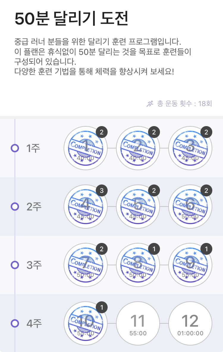 런데이 2025년 동장군 취임식 챌린지 3주 차가 설연휴로 인해 2주 동안 진행되다 보니 지난주 챌린지를 완료해 이번 주에는 50분 달리기 도전을 하지 않아도 되는 여유가 생겼지만, 마지막 남은 4주 차 챌린지를 꼭 완료하겠다는 마음에 이번 주에도 주 3회, 50분 달리기에 도전하기로 마음먹었다. 3주 차 과정을 복습할 것이냐 아니면 4주 차 과정을 미리 예습을 할 것이냐를 고민하다 순서대로 4주 차 과정을 하기로 했다.