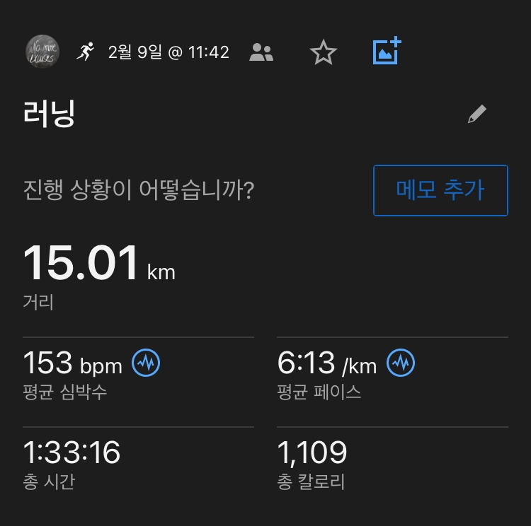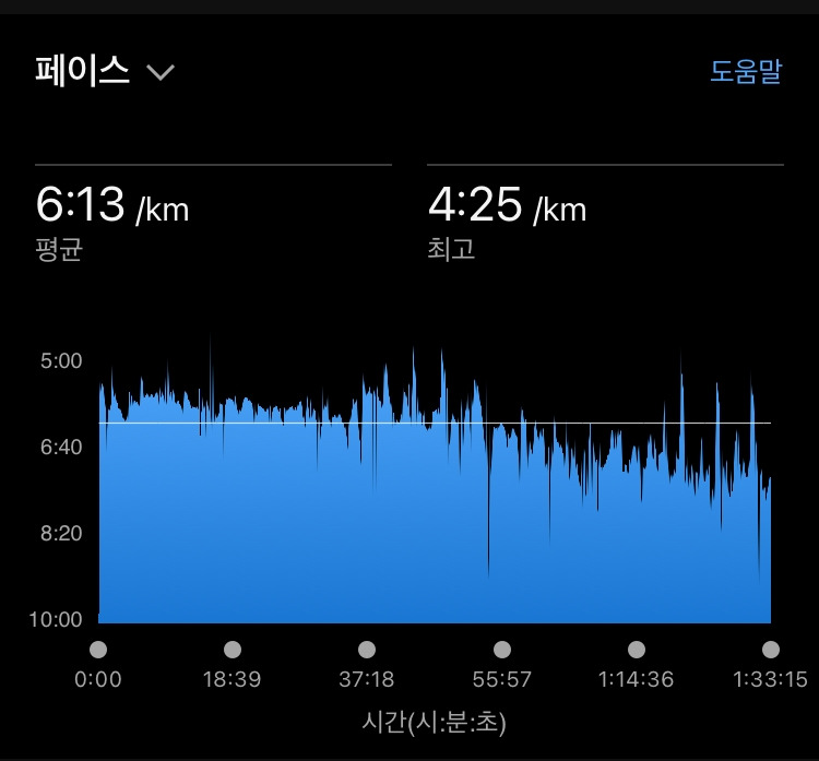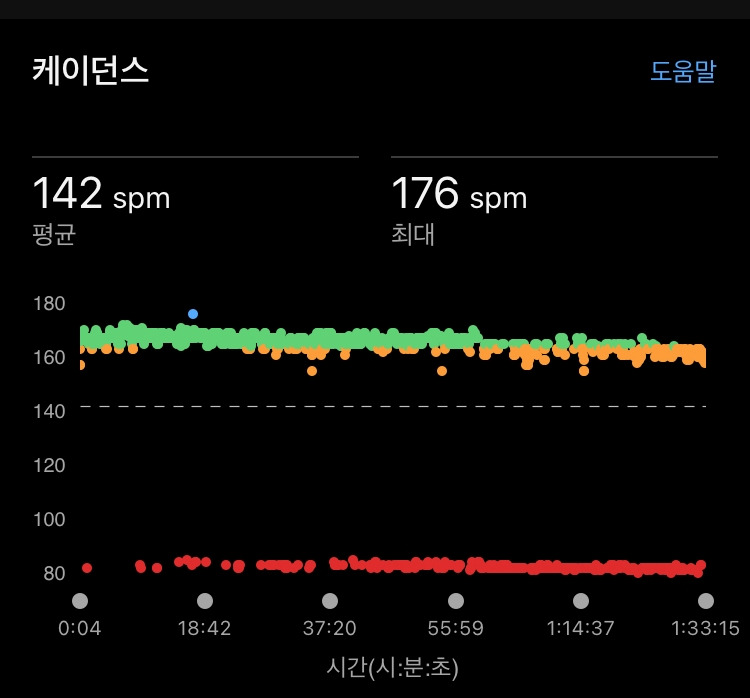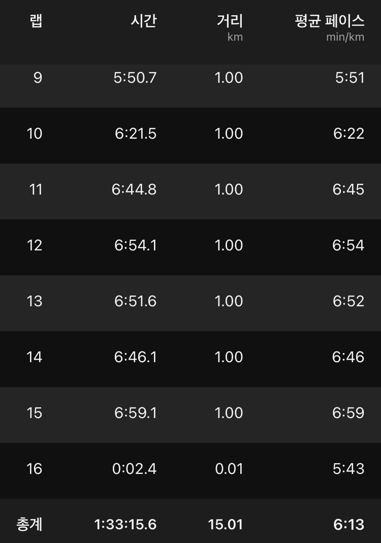 천천히 달리면서 케이던스가 엉망이겠다는 생각이 들었지만, 세부 기록과 페이스, 시간보다 더 중요한 것이 완주였기에 케이던스를 더 이상 염두에 두지 않았다. 아무리 케이던스가 좋아도 완주하지 못하면 아무 의미가 없기에, 완주 하나에만 의미를 두고 달렸다. 지난주 일요일보다 시간이 더 걸렸지만 15km의 거리를 완주했고 가족 외출을 위해 서둘러 귀가했다.