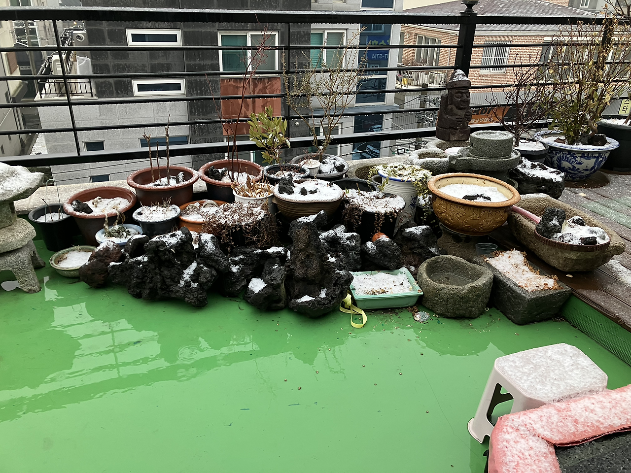 당장 옷을 입고 밖으로 나갈 기세라서 흥분한 아이를 진정시키고 거실 창밖에 서서 눈 내린 풍경을 바라보았다. 하얀 눈에서 뿜어 나오는 고요함과 적막함이 주는 아침 풍경은 따뜻한 남쪽에서 누리기 힘든 축복이다. 지난주 내린 눈보다 더 많이 내려 도로에 쌓일 정도였으니 정말 기대하지도 못했고 쉽게 볼 수 없는 정경이기에 아이와 함께 넋 놓고 함 참을 바라보았다.