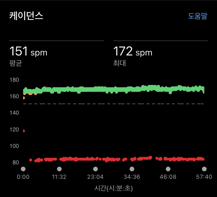 공원을 천천히 걸으면서 달리기 기록을 살펴보니 페이스를 조절했음에도 불구하고 케이던스가 많이 떨어지지 않아 다행스럽게 느꼈다. 지난주 120대로 떨어진 케이던스 수치를 보면서 걱정했지만 오늘의 달리기 기록을 통해 이 걱정이 한 번에 사라졌다. 물론 케이던스 수치가 마음에 드는 것은 아니다 평균 180대 수치가 나올 때까지 더 많은 노력이 필요하지만, 어떻게 달리면 케이던스가 낮아지는지 알았기에 케이던스를 높일 수 있는 달리기 자세를 연습하고 유지하는 훈련을 반복하면 자연스럽게 케이던스가 좋아질 것이라 생각한다.