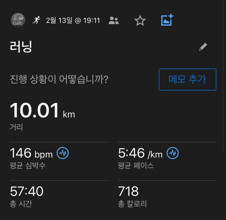 달리면서 50분 달리기만 할까라는 유혹이 들기도 했지만, 평일 10km 달리기 훈련을 하기로 계획했고 1월부터 지속적으로 훈련하고 있었기에 오늘의 달리기도 동일하게 유지하는 것이 좋겠다고 생각했다. 멈추고 싶다는 마음을 되로 하고 계속 달렸고 전날 5km 달리기 최고 기록을 세웠던 몸이 풀리면서 달리기 편했다. 점점 어두워져 가는 공원에서 거친 숨소리를 내며 홀로 달리는 내가 대견하기도 했지만, 이제 한 번만 더 하면 챌린지에 성공할 수 있다는 기쁨으로 50분 달리기 도전을 완료할 수 있었다. 쿨다운을 하며 오늘의 달리기를 완주한 나를 스스로 칭찬하며 호흡을 정리했다.