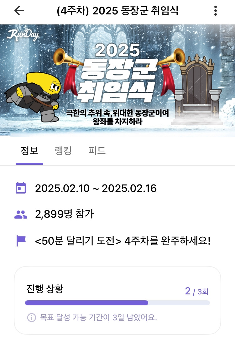 무려 4주에 걸쳐 도전한 챌린지이기도 하고 진정한 러너가 되고 싶어 겨울의 추위와 싸운 흔적을 남기고 싶었기에 그 어떤 챌린지보다 꼭 성공하고 싶었다. 특히 충분히 예상된 상황에 의해 달리기를 하지 못하게 될 경우까지 미리 염두하여 달리기 일정을 미리 준비할 정도로 달리고 싶어도 달릴 수 없는 상황까지도 피하고 싶었다. 이번 주에는 숫자 달리기까지 해서 주 3회 달리기보다 더 많이 달려서 욕심내지 않고 동장군 취임식에 집중하고자 했다.