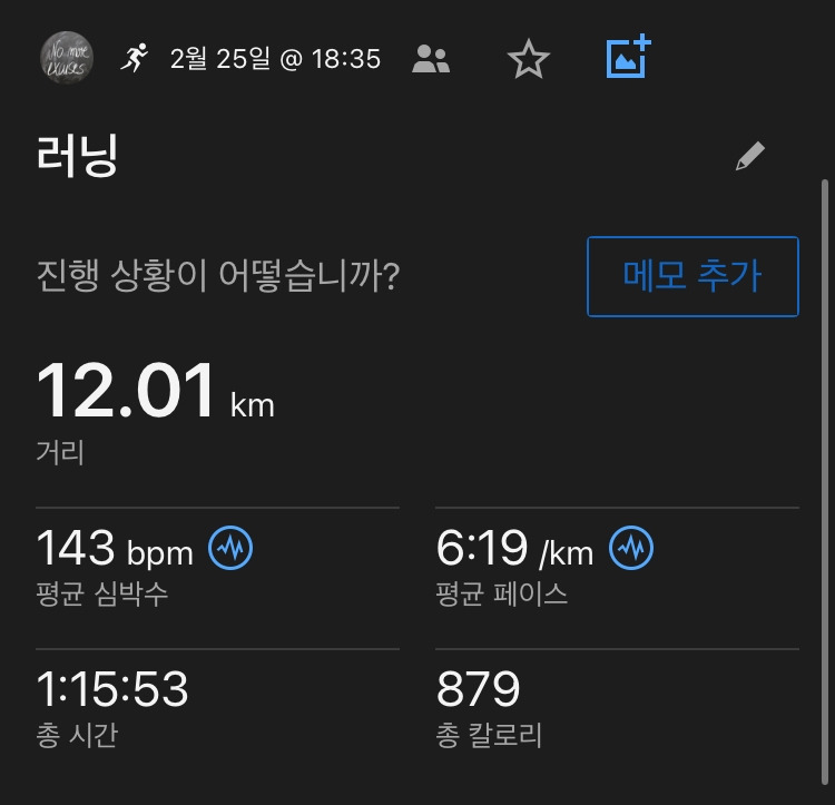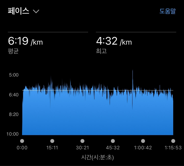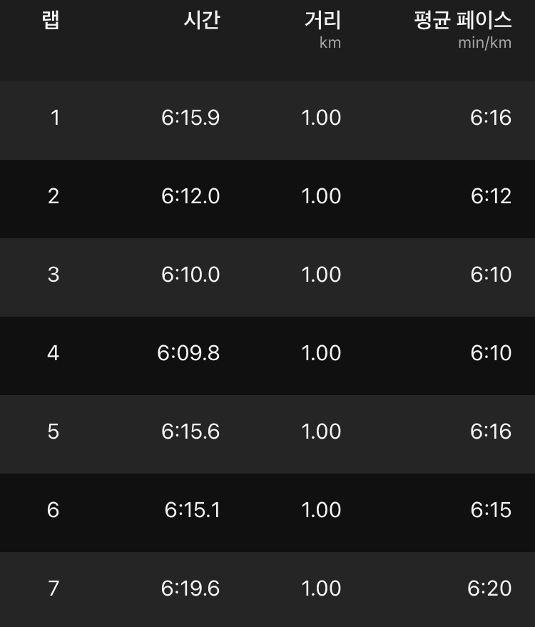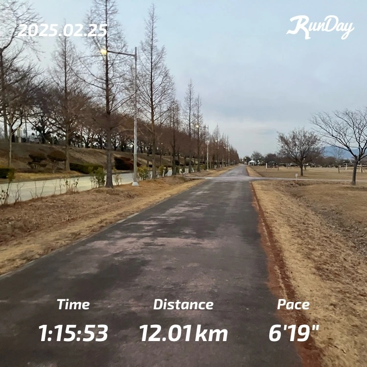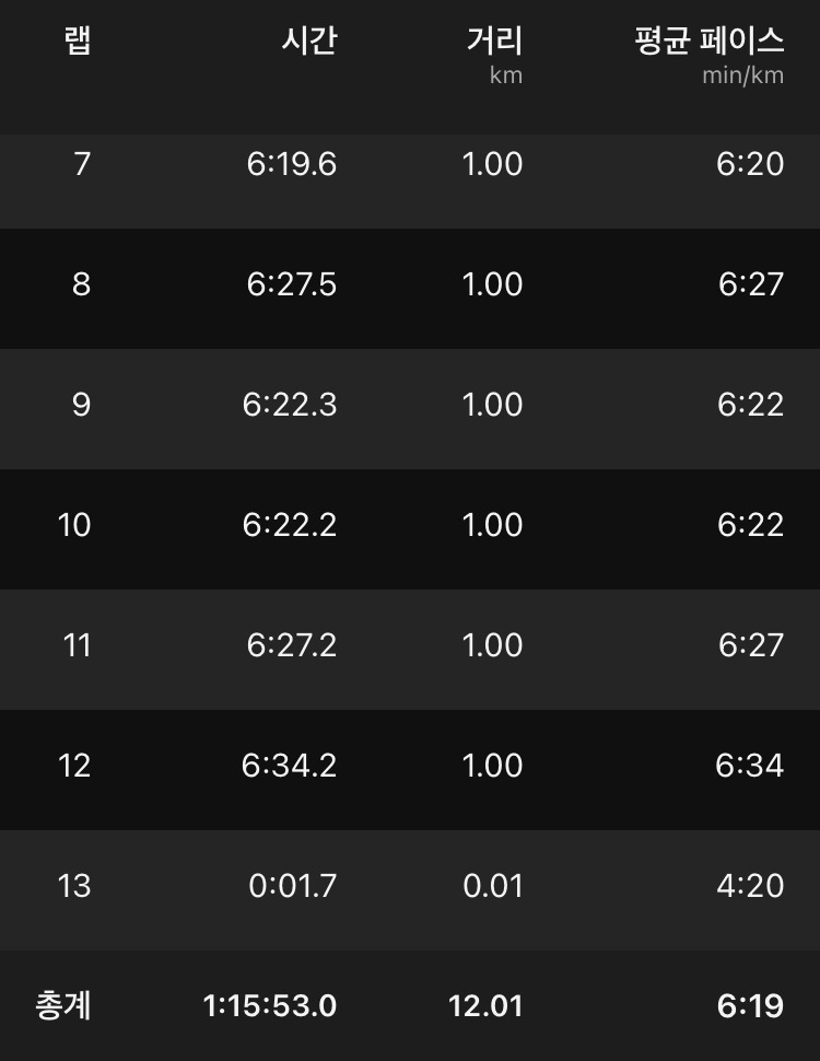 다행스럽게도 12km 달리기 훈련을 하는 동안 무릎 통증을 거의 느끼지 못했고 체력적으로 힘들지도 않았다. 이 페이스가 지금 내 실력에 맞는 페이스라는 생각이 들며 남에게 보여주기 위해 페이스에 욕심을 내는 어리석은 행동을 하지 않기로 마음먹었다. 마음먹는다고 해서 욕심을 쉽게 내려놓을지는 모르겠지만, 타인에게 인정받기 위한 달리기가 아닌 나를 위한 달리기, 나만의 속도로 달리는 시간임을 분명히 할 것이다. 이것이 나의 페이스고 온전히 달리기를 누릴 수 있는 속도라고 느꼈다.