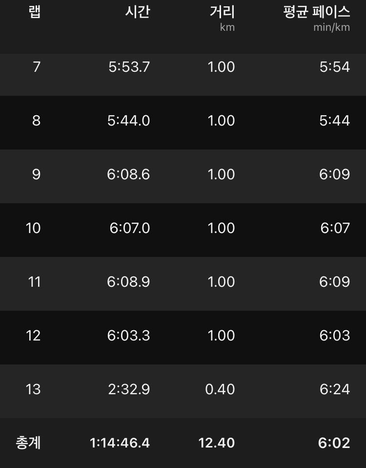 1km 정도 걸으며 웜업을 하고 무릎통증에 각별한 주의를 기울이며 달렸다. 천천히 달리면서 페이스를 조절했고 오늘의 달리기 목표인 12km를 완주하기 위해 한 걸음 한 걸음 내딛으면서 온전히 달리기를 누리기 위해 노력했다. 달리는 시간만큼 온전히 나에게 관심을 가지는 시간은 없다. 어느 부위에 통증이 있는지 깊은 관심을 기울여 부상의 예방하기 위한 노력도 하지만 달릴 때 잠자고 있던 온몸의 세포들이 기지개 껴는 듯한 느낌은 달리기 싫을 때도 달리기 잘했다는 기분이 들게 한다.