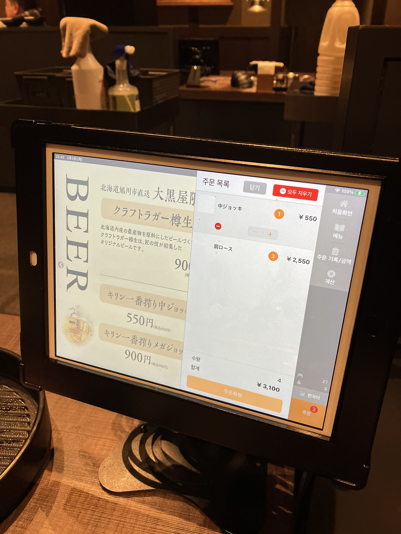 삿포로시에 있는 다루마와 달리 넓은 징기스칸 고쵸메는 아사히카와보다 더 넓은 공간이라서 깜짝 놀랐고 테이블마다 태블릿 PC를 이용해 주문을 할 수 있어 한 번 더 놀랐다. 혼밥을 하는 사람들을 위한 자리까지 있어 손님을 배려하는 하코다테 사람들의 마음에 또 한 번 더 놀랐다. 상업을 중시하던 이곳 사람들의 마음이 녹아 있는 손님에 대한 배려는 늘 배워야 하는 가치로 생각한다. 때론 과도한 친절이란 평가를 받기도 하지만 이곳 사람들의 친절은 세계 최고 중 하나이다.