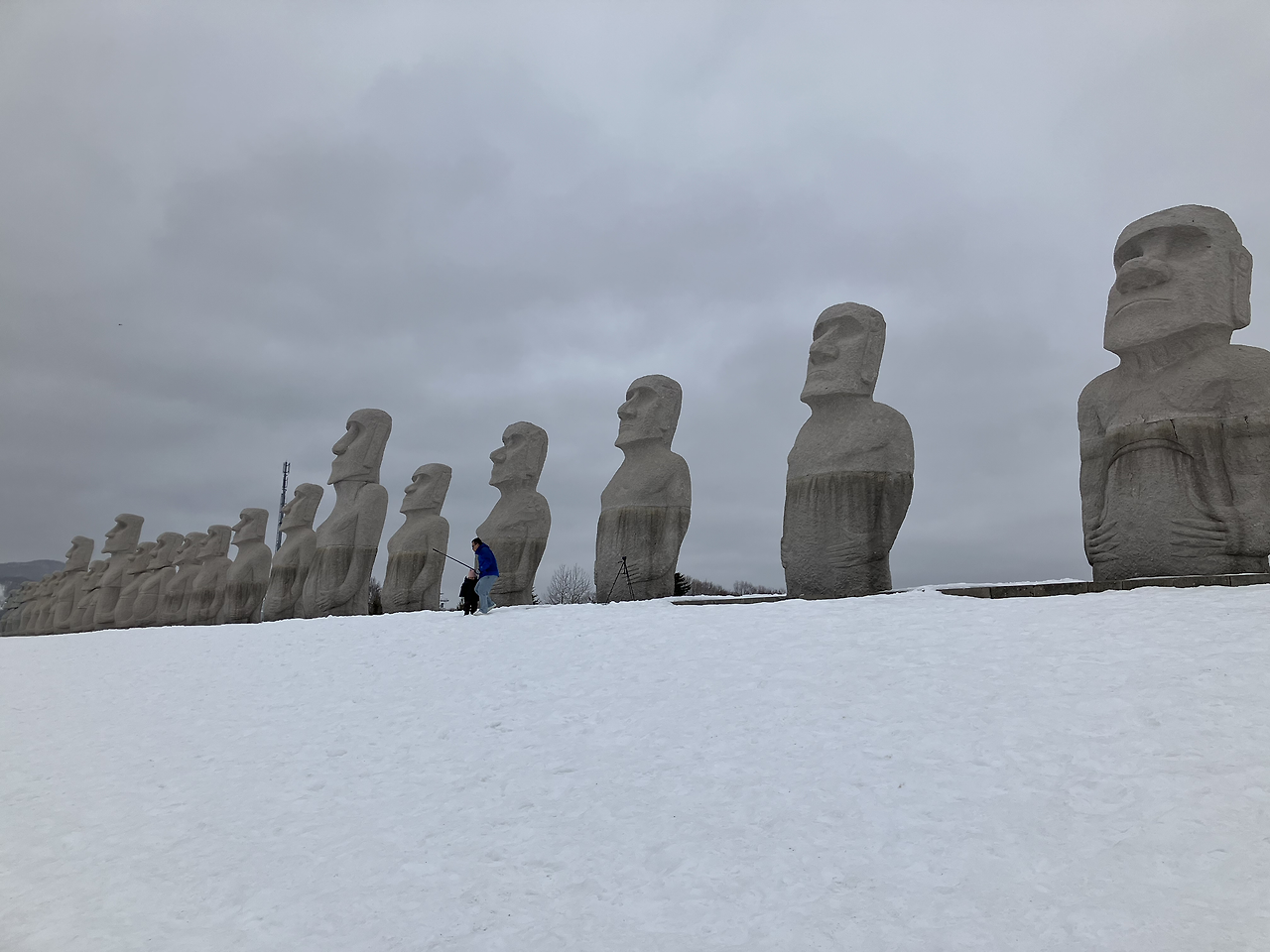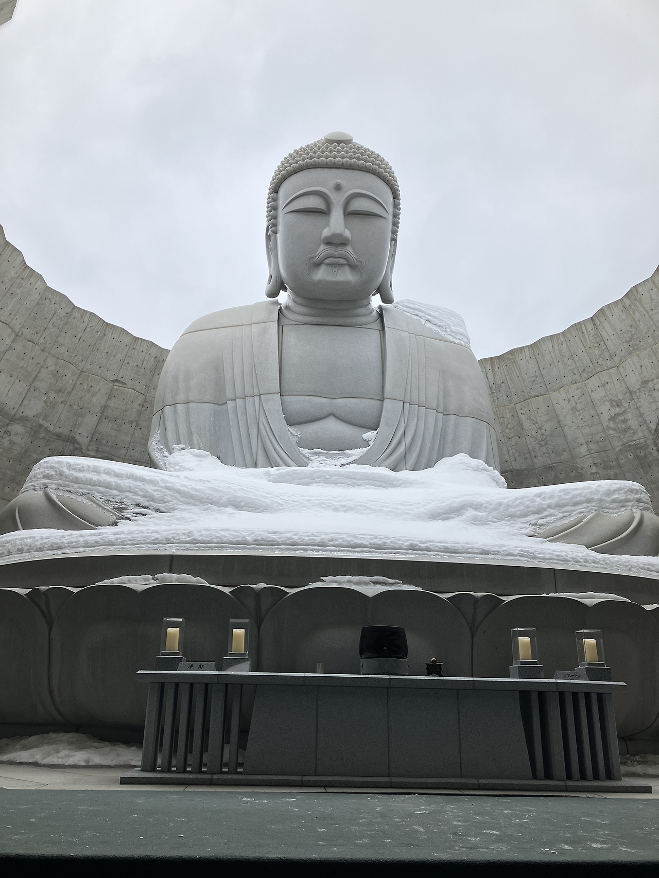 올라오는 길에 보이는 작은 점이 사실 부처님의 머리라는 것을 알게 되기까지는 오랜 시간이 걸리지 않는데, 거대한 부처님뿐만 아니라 입구부터 모아이 석상이 반겨주는 부처의 언덕은 영국 이외의 곳에 유일하게 스톤헨지 모조품이 전시된 곳이기도 하다. 모아이 석상과 스톤헨지를 홋카이도에서 볼 수 있다는 이색적인 공간이기도 하지만 원래 이곳은 추모의 공간으로 인근 공동묘지가 조성되어 있다.