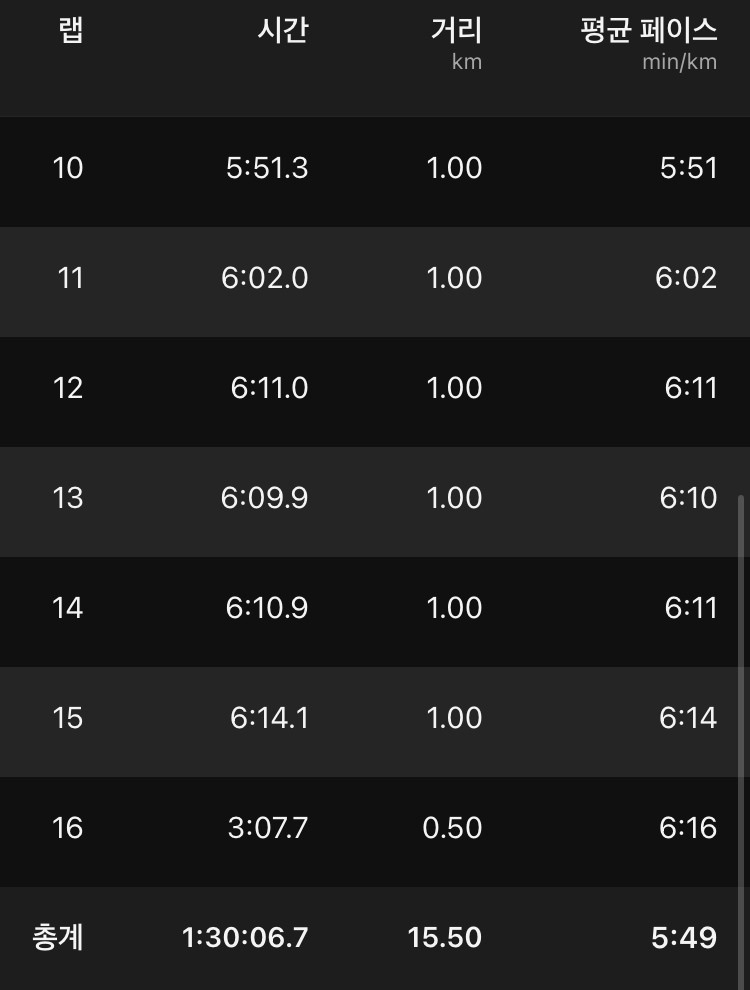 6월에 참가할 예정인 하프 마라톤 대회에서 완주하기 위해서는 지금부터 거리를 조금씩 늘려야 하기에 15.5km의 거리는 충분하지 않다고 느낀다. 대회 참가 한달 전부터는 23km의 거리를 달릴 수 있도록 지금부터 조금씩 거리를 늘려갈 계획이다. 이런 훈련을 계속한다면 4월에 있는 기부앤레이스 10km 대회도 여유롭게 달릴 수 있을 것이다. 일요일의 여유를 누리며 대회의 여유를 상상하며 달리기로 이렇게 행복할 수 있다는 것을 배웠다.