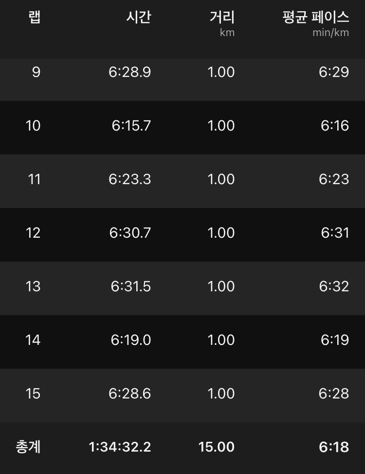 지각할 수도 있겠지만 새벽에 일찍 일어난다면 불가능한 것도 아니다. 만약 15km의 거리를 한 시간 안에 달린다면 굳이 새벽에 일찍 일어나지 않아도 된다. 하지만 아직 그럴 실력이 아니기에 출근의 압박을 피하기 위해서는 2시간이라는 여유로운 시간이 필요하다. 늦어도 6시에는 달리기 시작해야 웜업과 쿨다운까지 할 수 있는 15km 달리기 훈련을 할 수 있다.