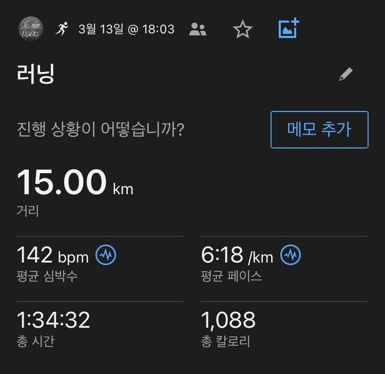 아직 새벽에는 무리라서 일찍 퇴근하고 15km 달리기 훈련을 했다. 지난주 마지막 3.1런 15.5km를 달렸기에 충분히 할 수 있다고 믿으며 거리가 늘어날수록 점점 무거워지는 다리를 위로했다. 위로가 부족했는지 점점 페이스가 느려지고 호흡이 거칠어짐을 느낄 수 있었지만 그럼에도 불구하고 끝까지 멈추지 않고 계속 달렸다. 페이스가 좋지 않았지만 무사히 완주할 수 있었다.