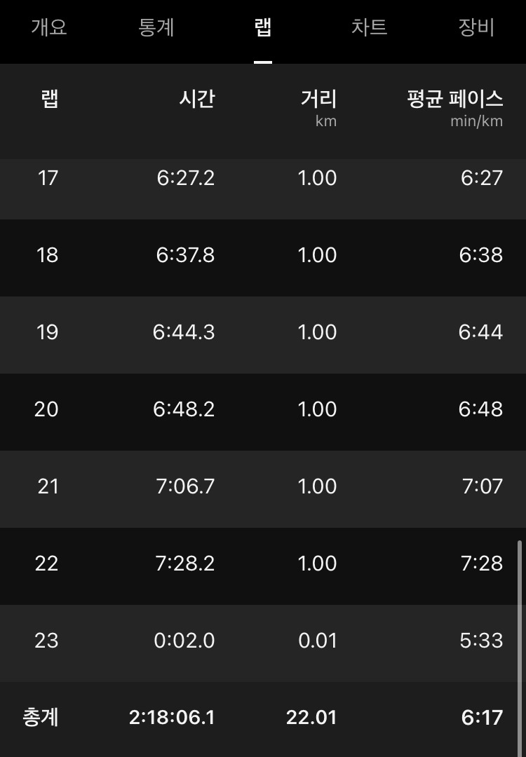 두 번째 색다른 시도는 하프 마라톤 달리기 훈련인데, 작년 런데이 애플리케이션의 메뉴 중 가상마라톤을 하며 두 번 하프 마라톤 달리기를 했었지만 아직 내가 감당하기에는 어려운 훈련이었다. 그다음 날 일상생활을 하는데 지장을 줄 정도로 몸상태가 좋지 않았고, 심지어 과욕으로 하프마라톤을 해서 처음 출전한 마라톤 대회에 정상 컨디션이 아닌 상태로 출전할지 말지를 고민하기도 했다.
