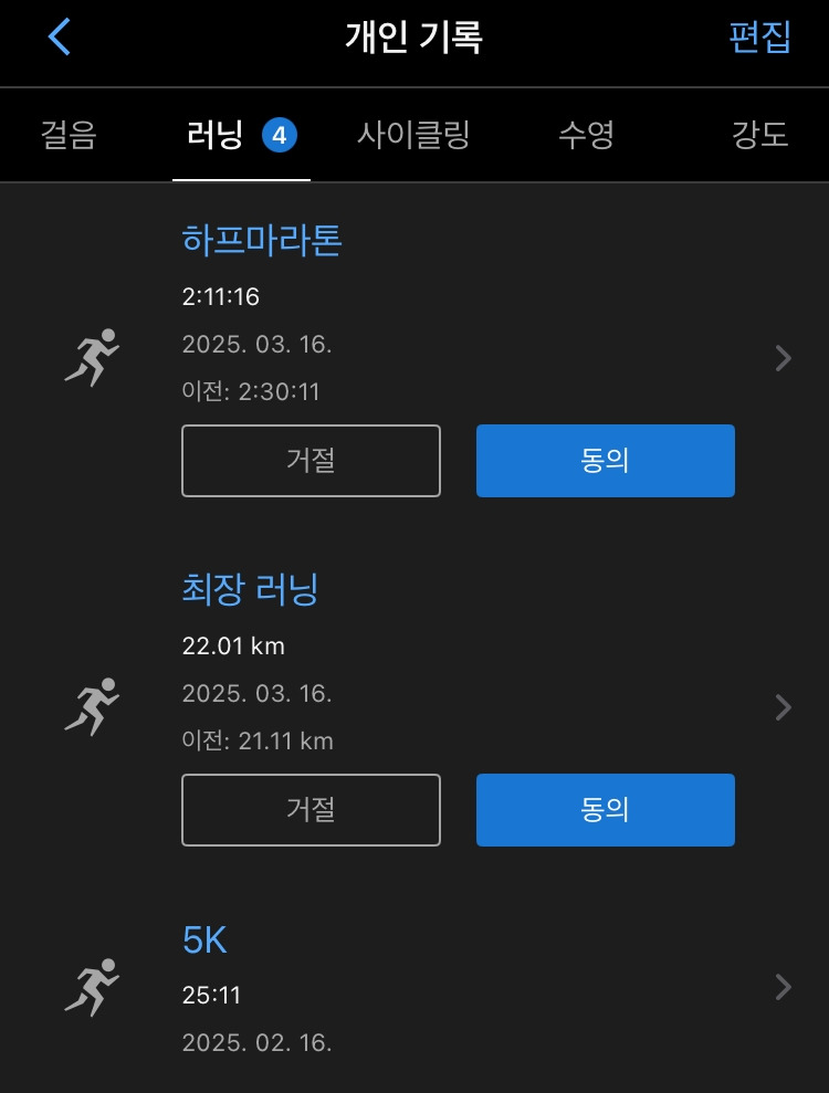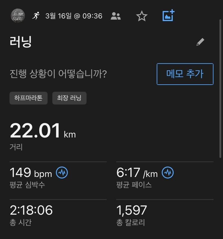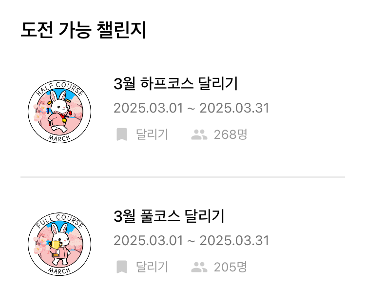 런데이 애플리케이션 3월 챌린지 중 하프 마라톤 달리기도 있었는데 이 챌린지도 사실 도전할지 말지를 한참 고민하고 결정했다. 아직 15km의 거리를 달리는 것도 힘들어하는 처지라 챌린지 달성이란 욕심을 채우기 위해 무리하면 다음의 달리기가 힘들다는 것을 몇 번의 경험으로 몸이 기억하고 있다. 무리해서 챌린지를 달성한다 한들 달라지는 것은 없다는 것을 느낀 후로는 챌린지 달성에 목을 매지는 않는다.