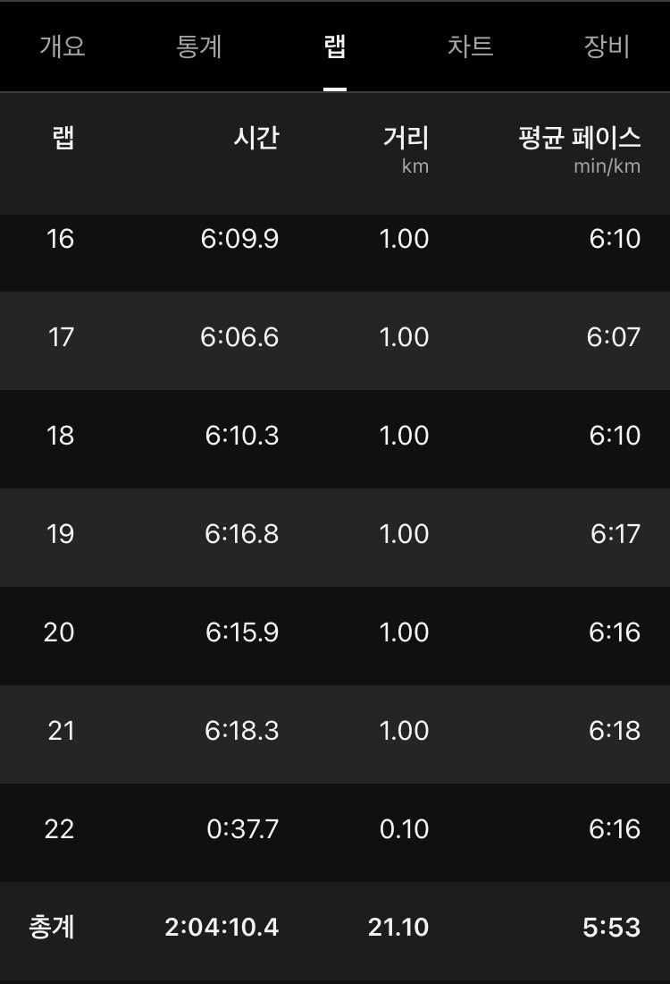 순간 머릿속에 강하게 드는 생각은 하프 마라톤도 이 정도인데 과연 풀코스를 달릴 수 있을까 의구심이었다. "할 수 있을까"라는 생각이 희미해지면서 그냥 10km 달리기에 만족해야 할지도 모른다는 일종의 체념을 하며 집으로 돌아가 휴식을 취했어야 했는데 최대 걸음수를 채운다고 무리해서 더 걸어버린 어리석은 행동까지 했었다.