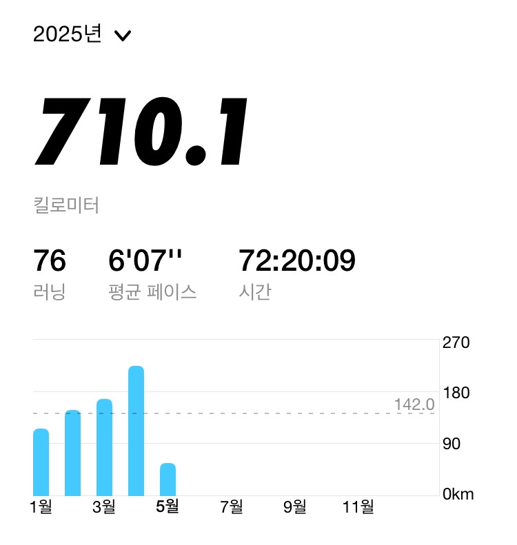 이 페이스라면 올 한 해 1,500km의 거리를 달릴 수 있어서 나이키런클럽에서 누적거리 2,500km 이상의 거리를 달린 '퍼플' 레벨이 될 수 있을 것이다. 물론 부상이 없다는 전제 조건하에서 가능하기에 나의 도전에는 성실함과 끈기 그리고 철저한 자기 관리가 필요하다. 그 누가 시켜서 하는 것이 아닌 나의 자유 의지로 내가 좋아서 하는 달리기로 나만의 무언가를 만들어가는 재미를 느끼며 5월에는 달리기 마일리지를 또 한 번 경신하며 새로운 흔적을 만들어 갈 것이다.