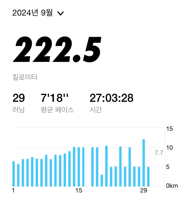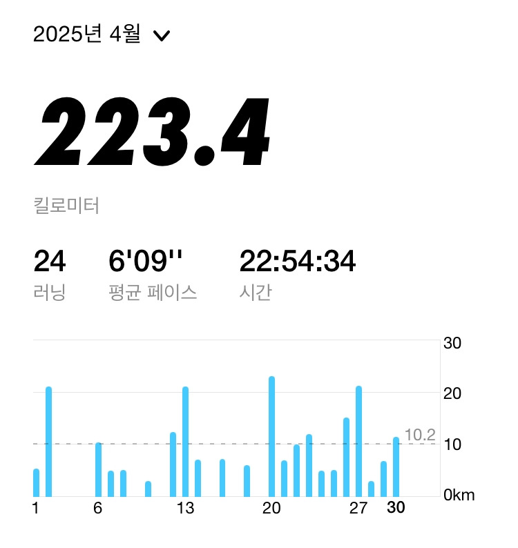 하프 마라톤 완주를 염원하는 나에게 하프 마라톤 완주 성공 이후 다음 단계는 마라톤 풀코스에 도전하는 것이기에 지금부터 서서히 달리기 마일리지를 늘려가야 한다는 생각이 들어 매일의 달리기를 도전하며 한 달 동안 달리기한 거리를 점검한다. 올해 4월에는 무모하게 달려 초보 러너에게는 과분한 222.2km를 달렸던 작년 9월의 기록을 넘어 223.4km를 달렸고 작년 한 해 동안 달렸던 704.8km라는 마일리지를 5월에는 충분히 경신할 수 있으리라 짐작한다.