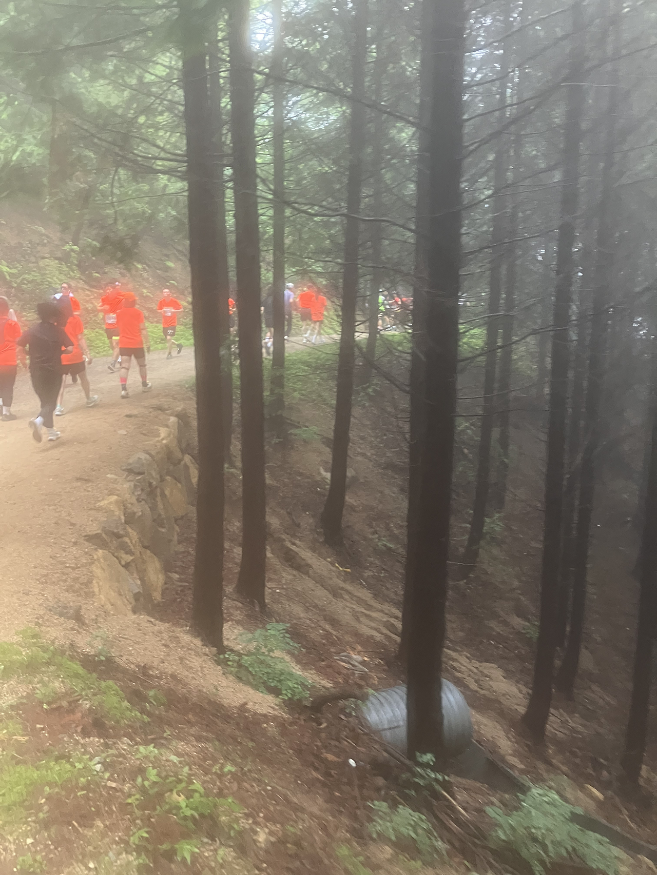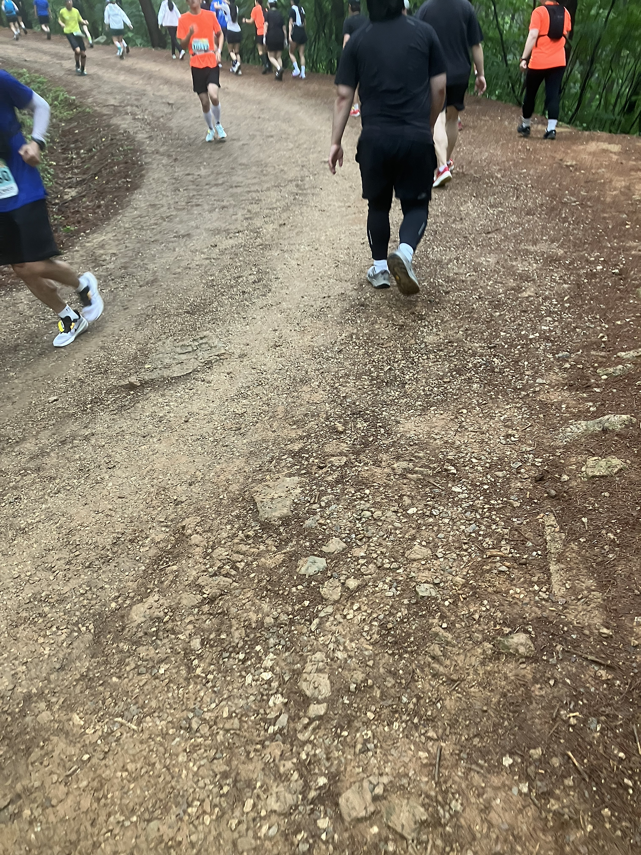 김해종합 운동장을 한 바퀴 돌고 대회장을 나오자마자 마주하는 업힐을 달리고 달려 진정한 오솔길에 들어서자마자 숨이 턱 밑까지 차올라 페이스를 유지하기 어려웠다. 다행히 내리막길이 나와 숨을 고르며 페이스를 유지하려고 했지만 바로 자갈과 진흙이 가득한 산길을 마주하고 당황했지만 앞서 달린 업힐보다 더 경사도가 높은 업힐을 달려야 함에 페이스를 포기하였다. 좁은 산길이라 추월도 어려웠고 전날 내린 비로 인해 미끄러웠기에 천천히 달려도 절대 걷지 않으려고 노력했다.