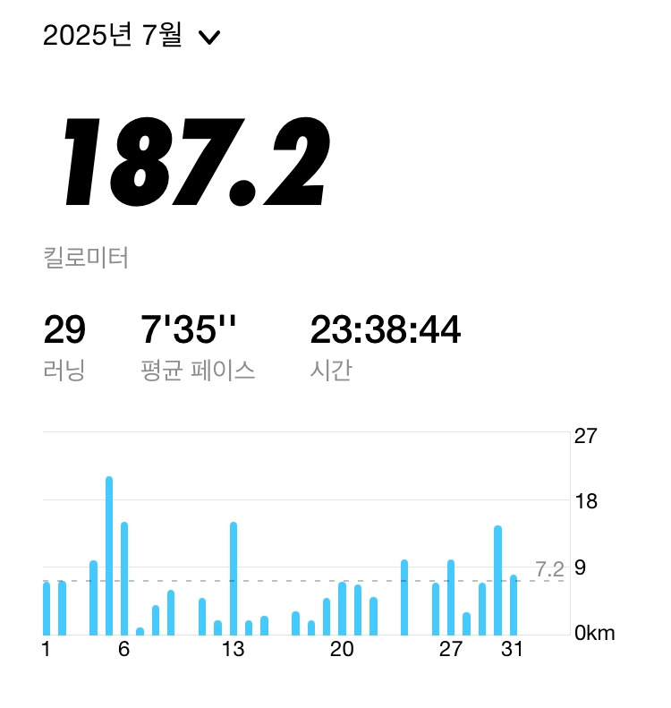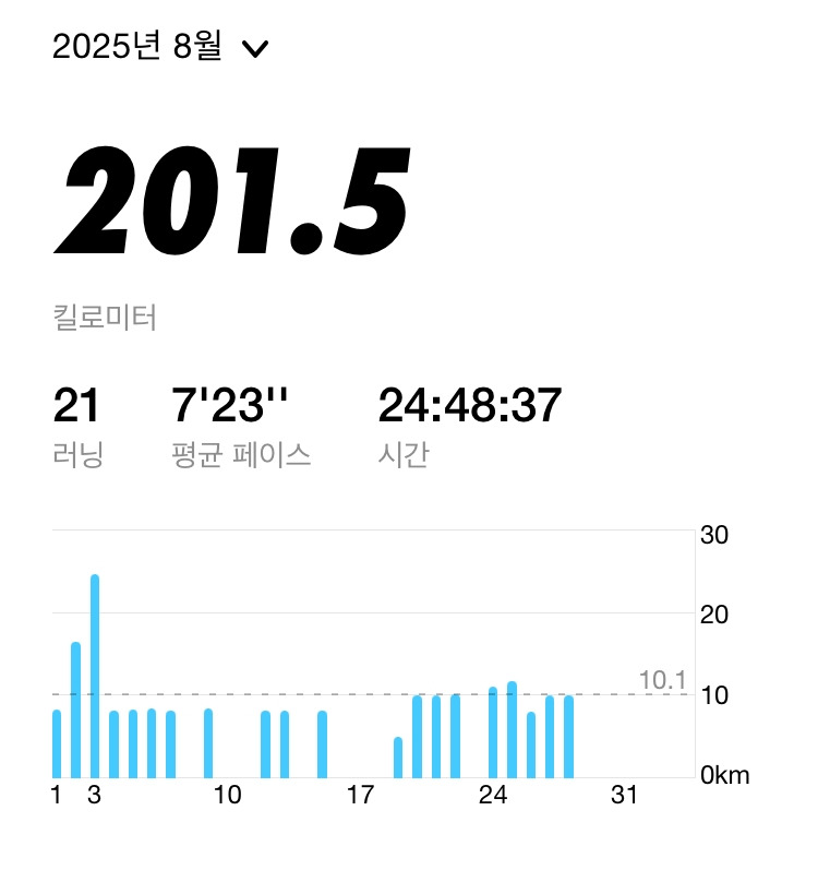 지난 5월, 283K를 달리면서 달리기 마일리지 300K를 꿈꿨지만 실력이 안 되는 수준 낮은 러너의 허상에 불가했다는 것을 증명했다. 6월, 7월 연속으로 200K 달성 실패를 경험하면서 더욱 체력을 만들어야 함을 느끼면서 보강운동에 집중했고 매일의 작은 노력들이 드디어 빛을 발휘해서 달리기 기준점이 조금 높아졌다.