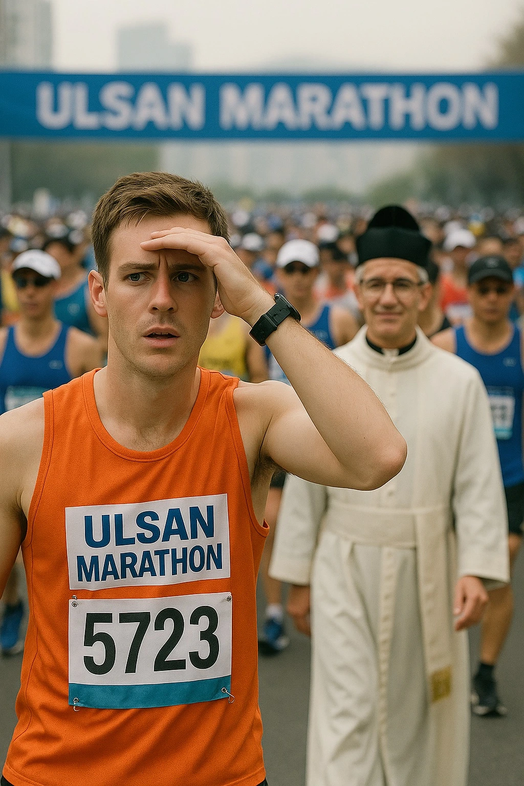 하지만 몇 개월 전부터 약속하고 신부님과 훈련을 한 상태라 약속을 반드시 지켜야 한다. 그래서 오랫동안 원했던 경주마라톤 참가를 포기하고 울산으로 향했는데 주차 이슈로 인해 하프 코스 출발시간에 늦어 웜업도 못한 상태에서 수많은 인파 속에서 신부님을 찾다가, 전화 연락이 되지 않아 애태우다 10km 주차들이 출발하는 틈에 늦게 출발했다.