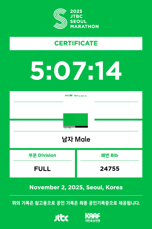 이제 25년 JTBC 서울 마라톤은 끝났다. 조금만 더 컨디션이 좋았더라면 5시간 안에 완주할 수도 있었겠지만 아쉽게도 5시간 안에 완주하지 못했다. 아쉽지 않다면 거짓말이겠으나 혹여 5시간 안에 완주했더라면 자만심에 빠져 더 성장할 포인트를 놓칠 수도 있었을 것이다.